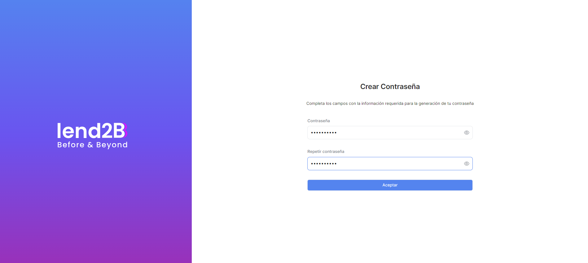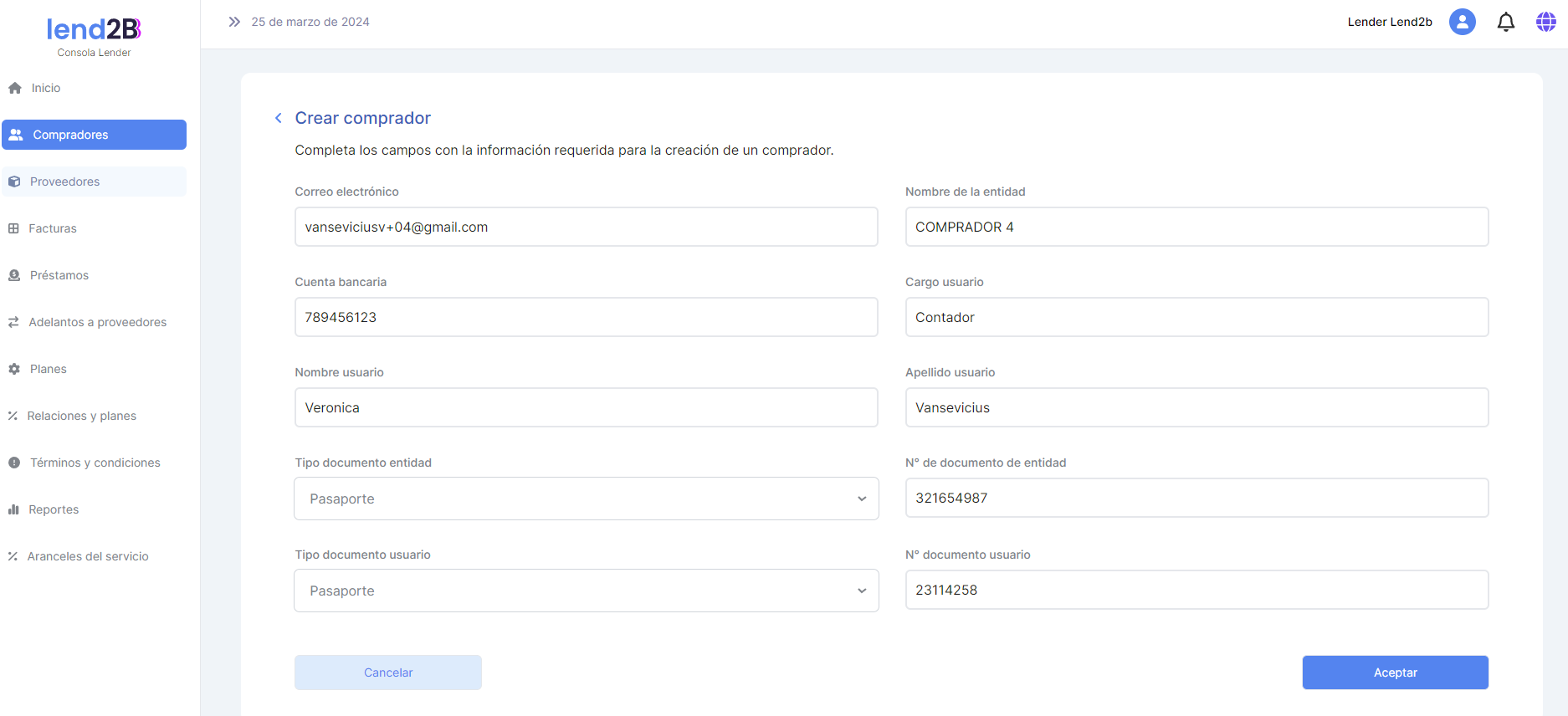 Al aceptar, el proceso de alta debe ser igual al del Comprador: ¡Lender creado con éxito!