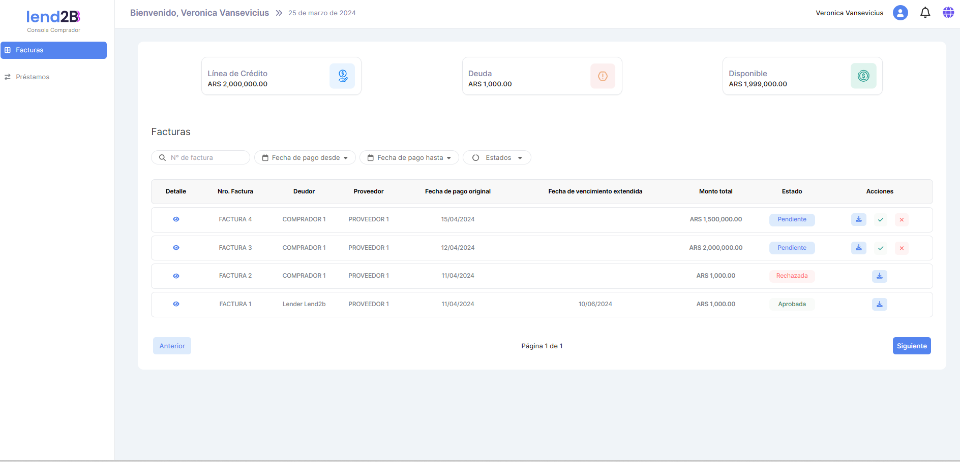 Importante: Cuando se acepta el análisis del riesgo el registro del Comprador pasa al estado Pendiente Línea de crédito en ambas consolas (Lender y Comprador)