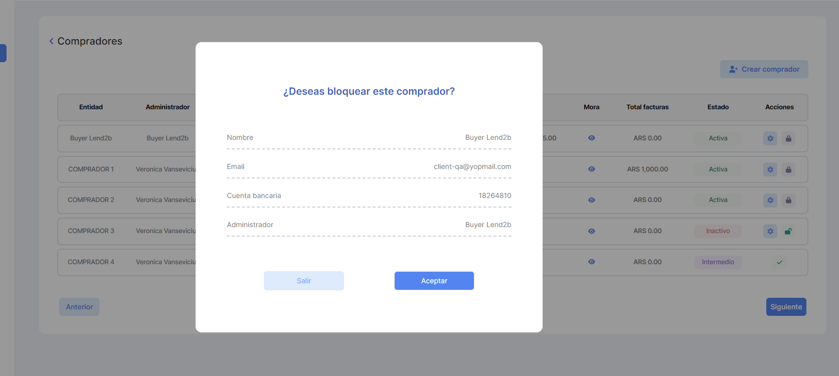 Para las acciones restantes: Bloquear, Desbloquear o Eliminar (solo cuando esta Pendiente), al seleccionarlas se debe mostrar un modal similar al que se muestra para Compradores