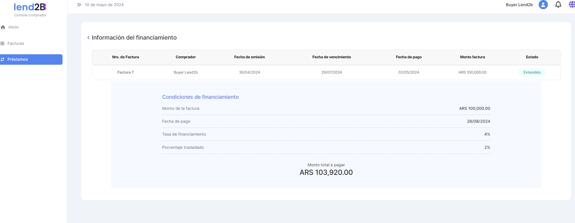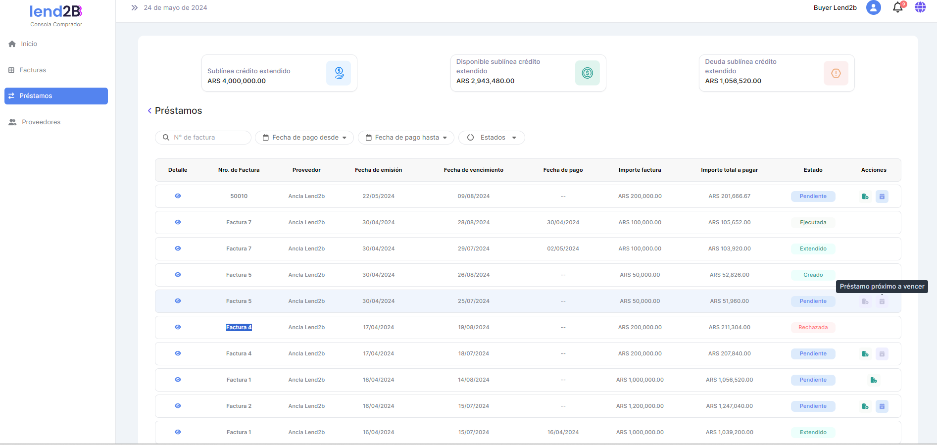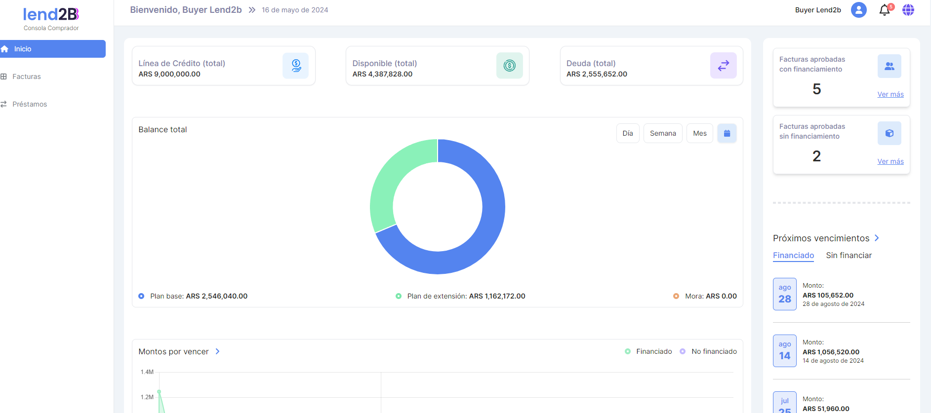 El Comprador debe visualizar en su Consola (Dashboard) los nuevos datos de sus líneas de crédito