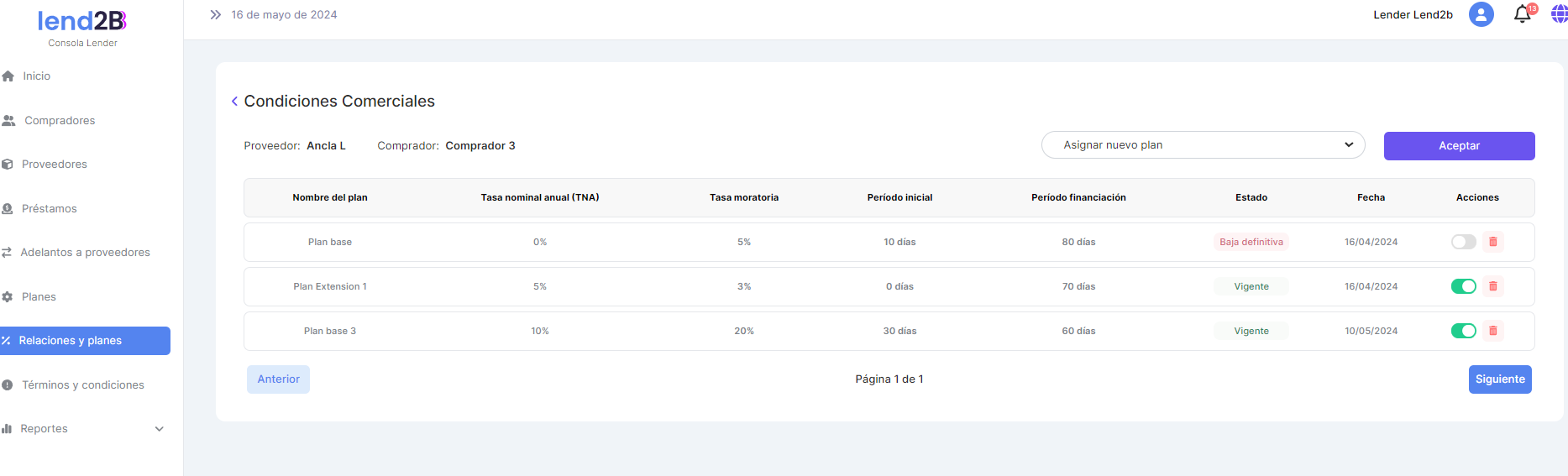Al seleccionar la opción de Solicitar refinanciación se debe mostrar los Planes de refinanciación contemplados en la relación comercial entre el Comprador y el Proveedor