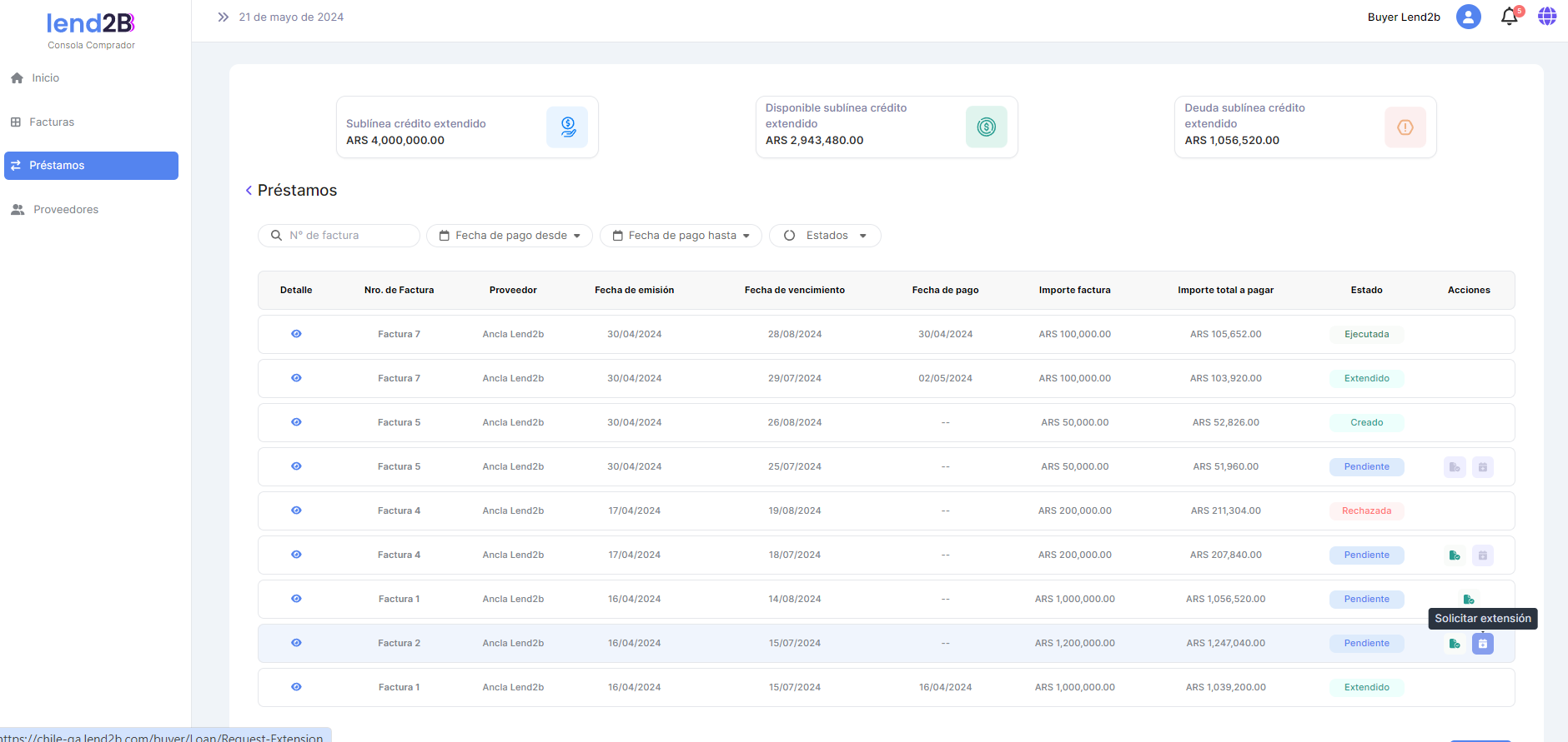 Cuando el Comprador solicita una refinanciación luego del vencimiento, tanto para un Préstamo Base como para un Préstamo Extendido, el flujo de aprobación o rechazo debe estar condicionado por el impacto de la solicitud de refinanciación en el Disponible de la sublínea de extensiones y en el % de sobregiro definido para el Comprador para sea sublínea.