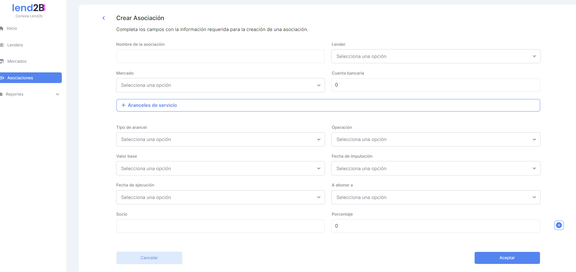 Aplicación de aranceles: Definición de aranceles en base a la combinación de carga de campos en la Consola Lend2B