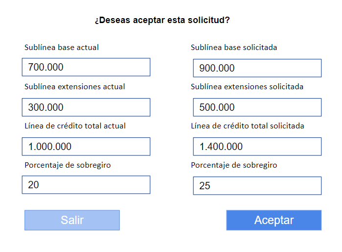 Los campos visualizados deben mostrar las líneas de crédito actuales.