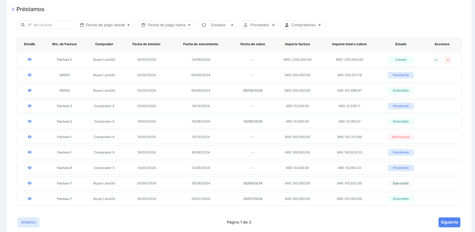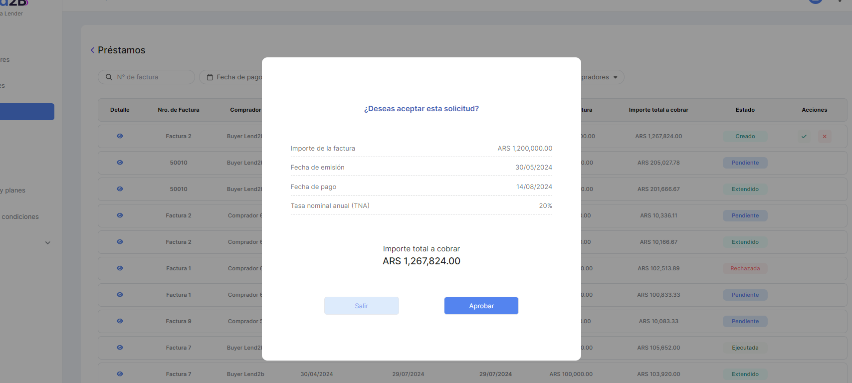 Desde Acciones se debe poder Aprobar o Rechazar el Préstamo extendido
