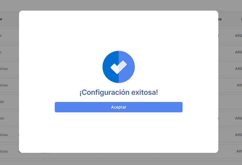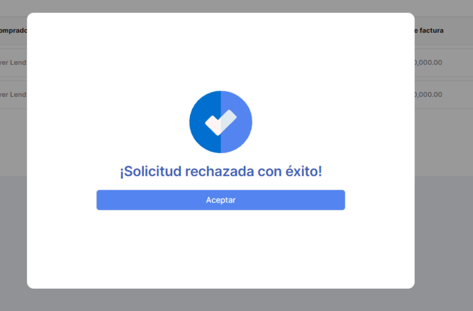 La acción Aceptar debe estar deshabilitada pero al seleccionar la opción debe aparecer un modal similar al siguiente:
