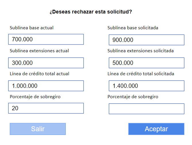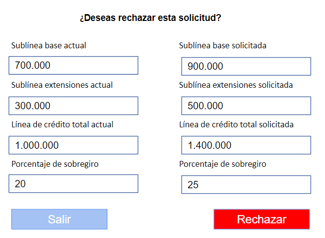 No es posible aceptar este solicitud de extensión dado que se excede la sublínea extensiones. Se requiere la actualización de las líneas de crédito.