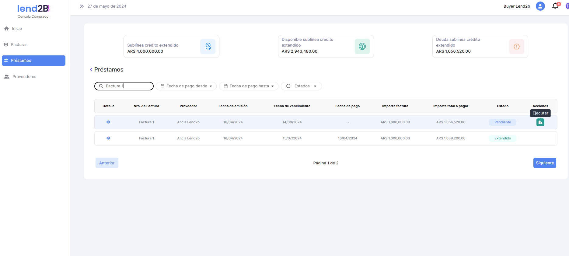 Se habilita la acción de Ejecutar en el registro del Préstamo refinanciado.