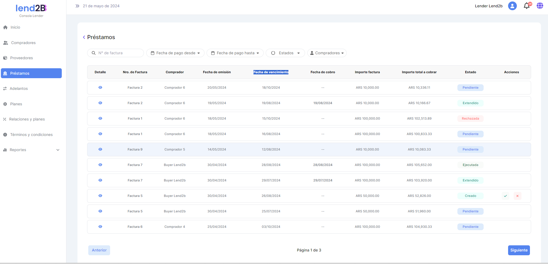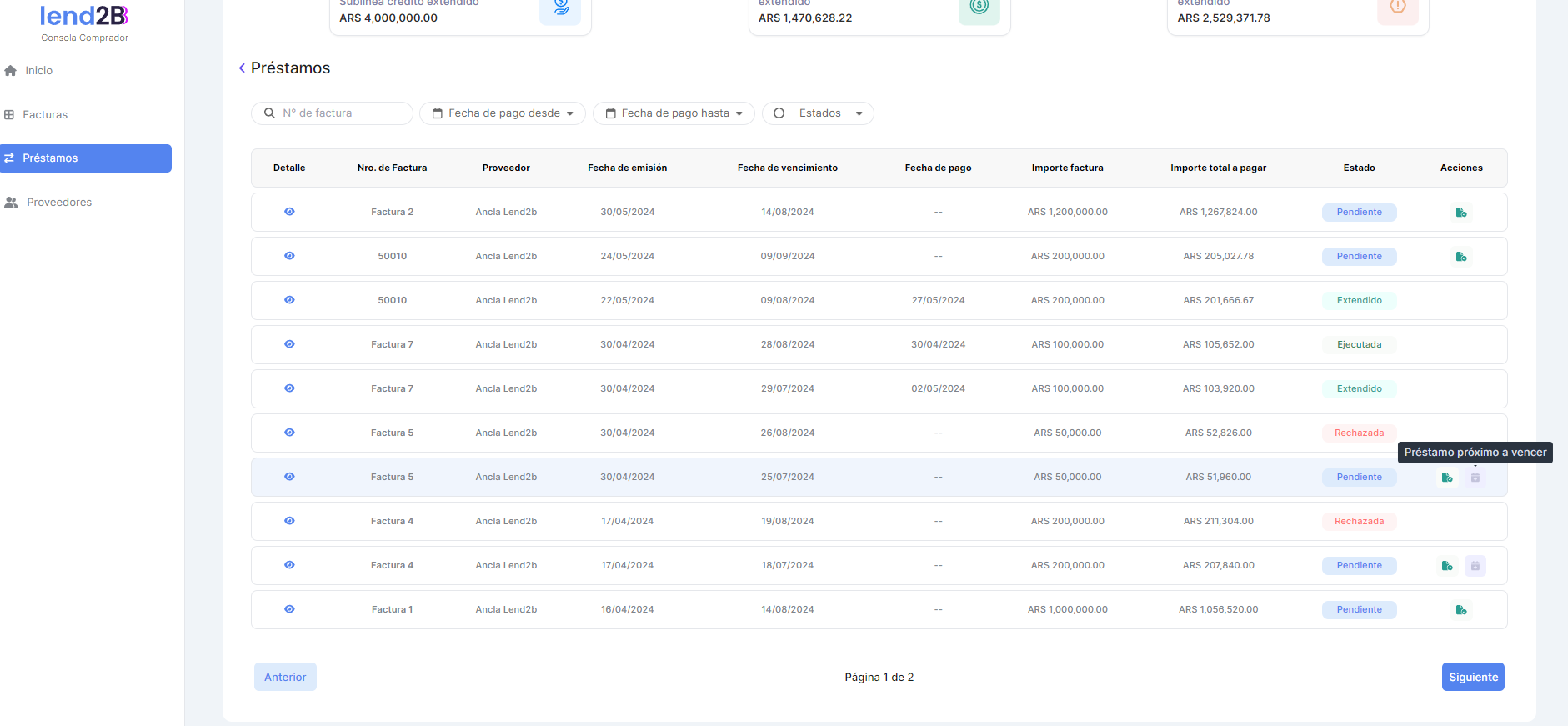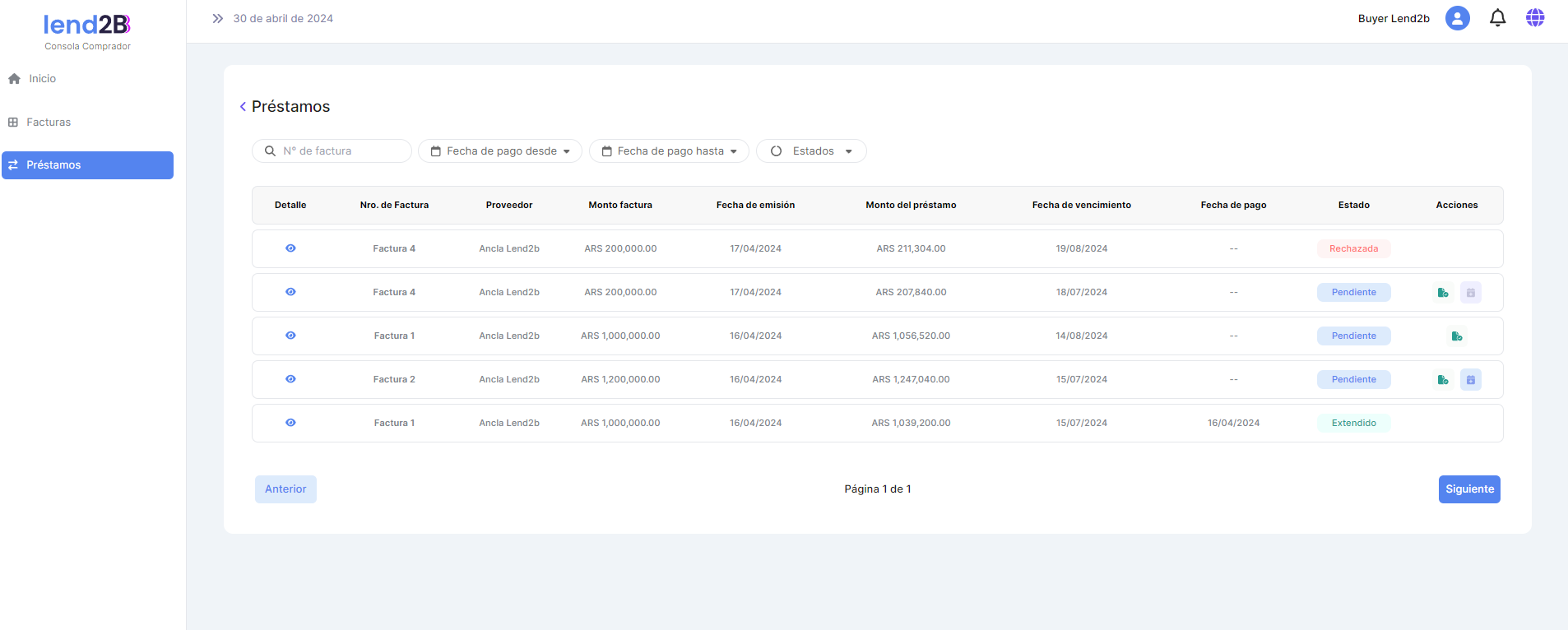 Cuando el Comprador quiere solicitar un Préstamo extendido, tal cual se desarrolló en el Sprint 18 para las refinanciaciones, el flujo de solicitud, aprobación o rechazo por parte del Lender debe estar condicionado por el impacto de la solicitud en el Disponible de la sublínea de extensiones y en el % de sobregiro definido para el Comprador.