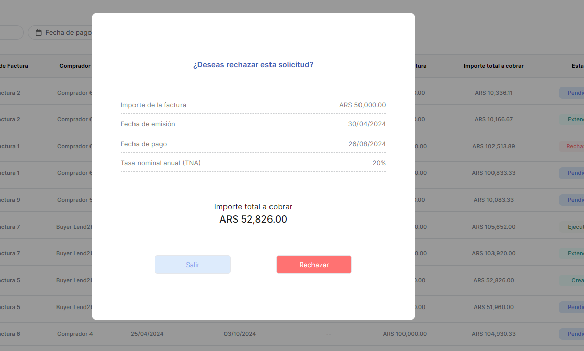 Si el resultado es >= 0, es decir, el disponible junto con el sobregiro alcanza para cubrir la refinanciación, se puede aprobar o rechazar.