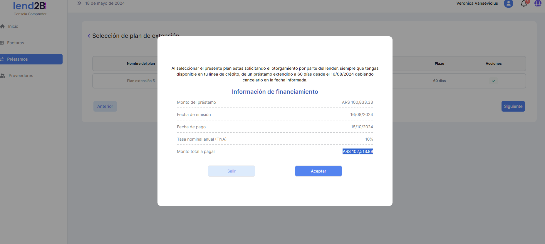 Al seleccionar el presente plan estas solicitando el otorgamiento por parte del lender, aún sin disponible en tu línea de crédito, de un préstamo extendido a [Plazo del plan] días desde el [Fecha de vencimiento Plan Base]. El otorgamiento del mismo queda sujeto a la evaluación del lender.