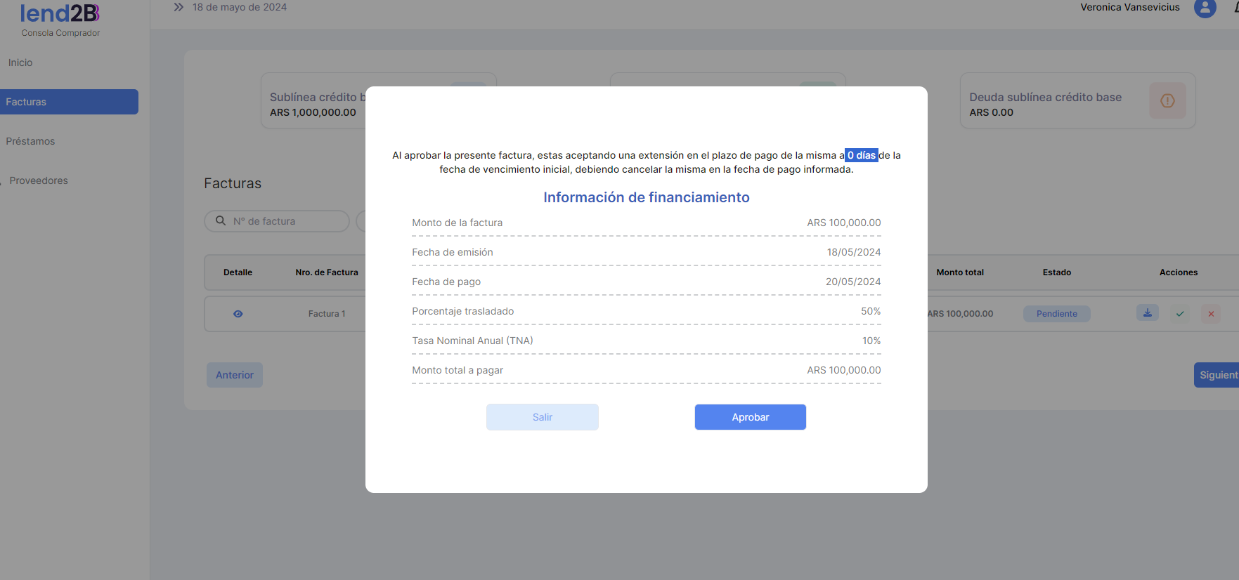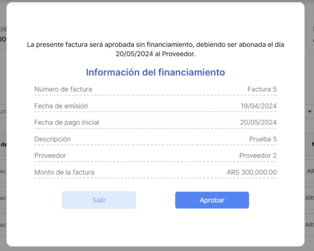 Dato cargado en campo Aprobación de financiamiento de factura: 5 días hábiles