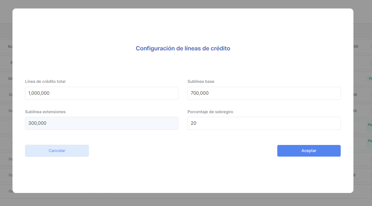 El % de sobregiro aplica sobre el total de la sublínea base. Ejemplo: si la sublínea base es de 1.000.000 y el sobregiro es de 20% la sublínea se amplia por un total de 200.000.