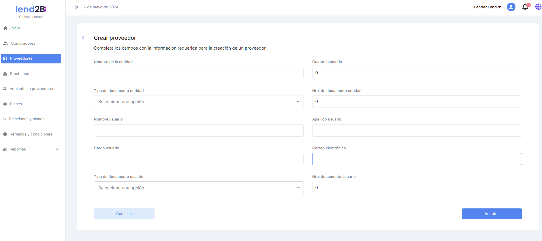 Se solicita incluir una nueva sección en el Menú del Proveedor con el nombre Gestiones al Lender debajo de Compradores