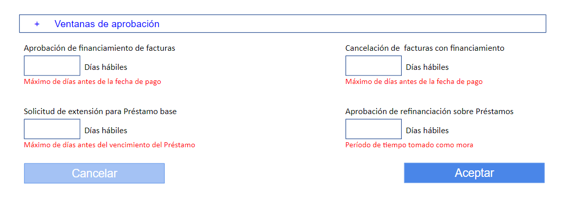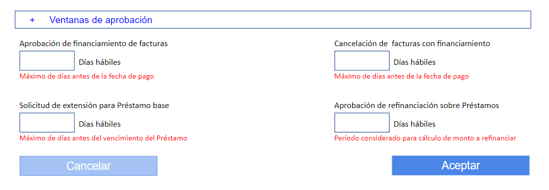 En este campo se debe completar la cantidad máxima de días hábiles antes de la fecha original de pago de la Factura, que el Lender requiere para poder financiar la misma.
