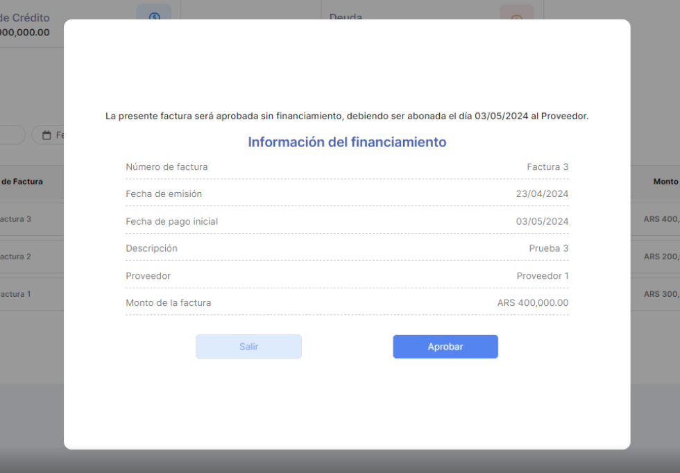 Si Fecha de aprobación > Fecha de pago - Campo aprobación de financiamiento de facturas: Se procede a aprobar sin financiamiento
