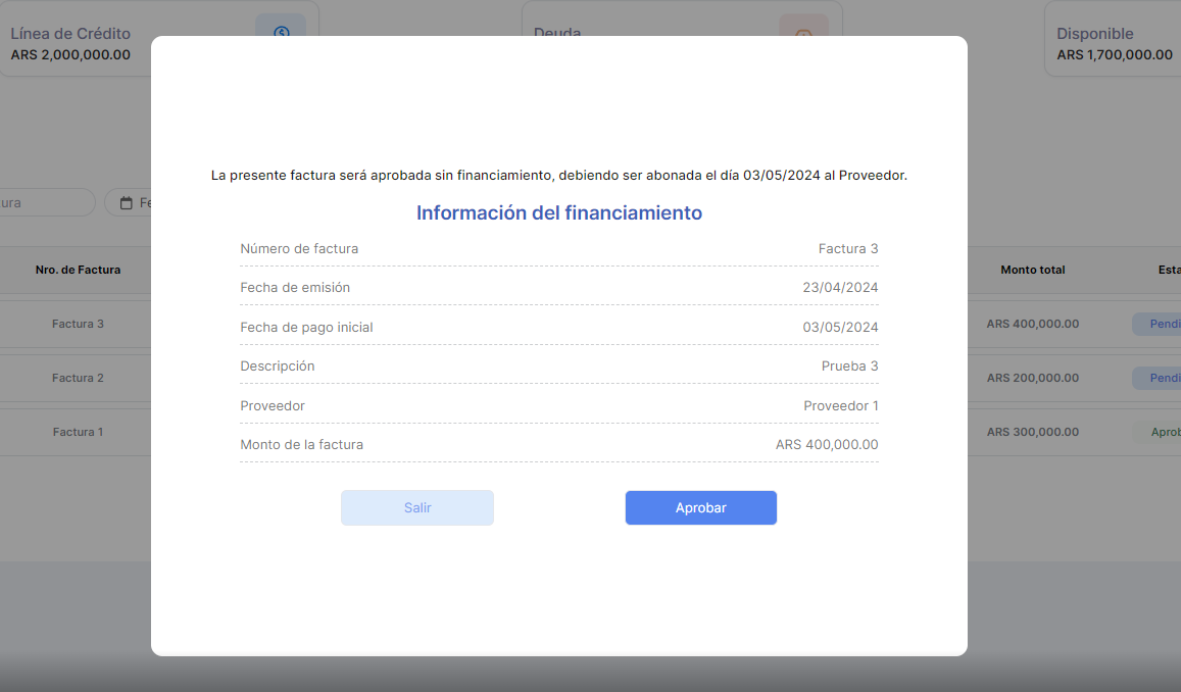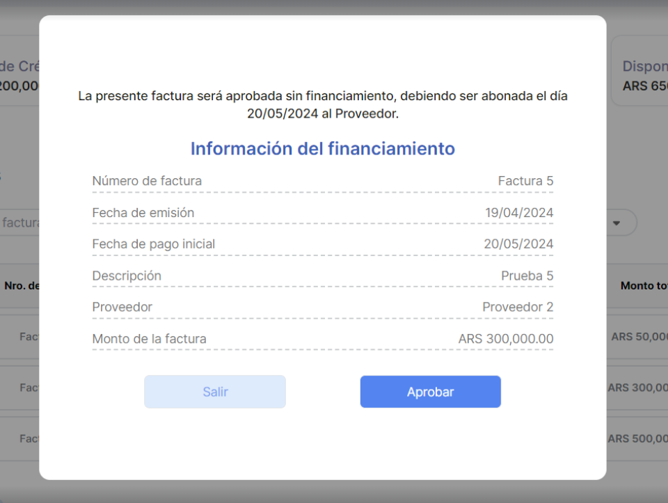 Si Fecha de aprobación <= Fecha de pago - Campo aprobación de financiamiento de facturas: Se procede a verificar el disponible pudiendo aprobar con o sin financiamiento