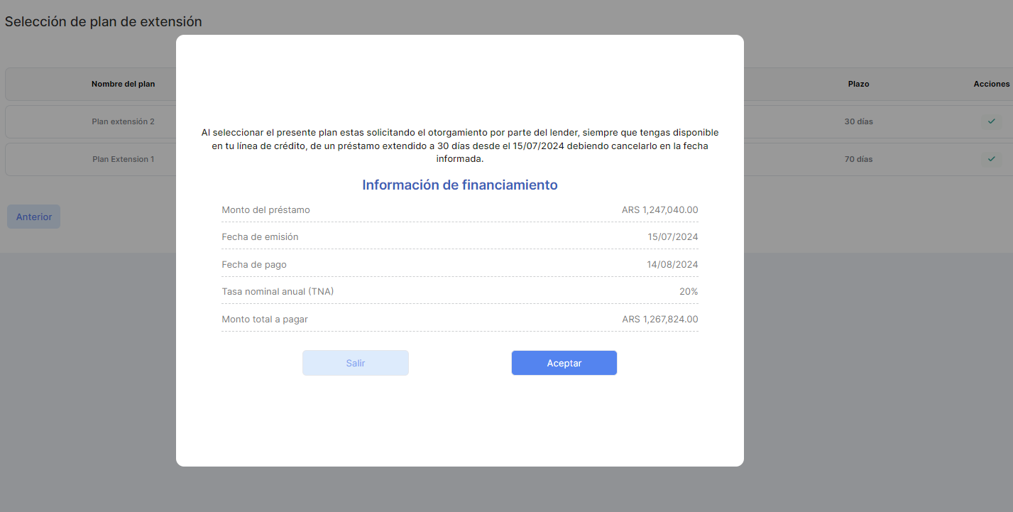 Al seleccionar el presente plan estas solicitando el otorgamiento por parte del lender, aún sin disponible en tu línea de crédito, de un préstamo refinanciado a [Plazo del plan] días desde el [Fecha de vencimiento Plan Base o el extendido según corresponda]. El otorgamiento del mismo queda sujeto a la evaluación del lender.