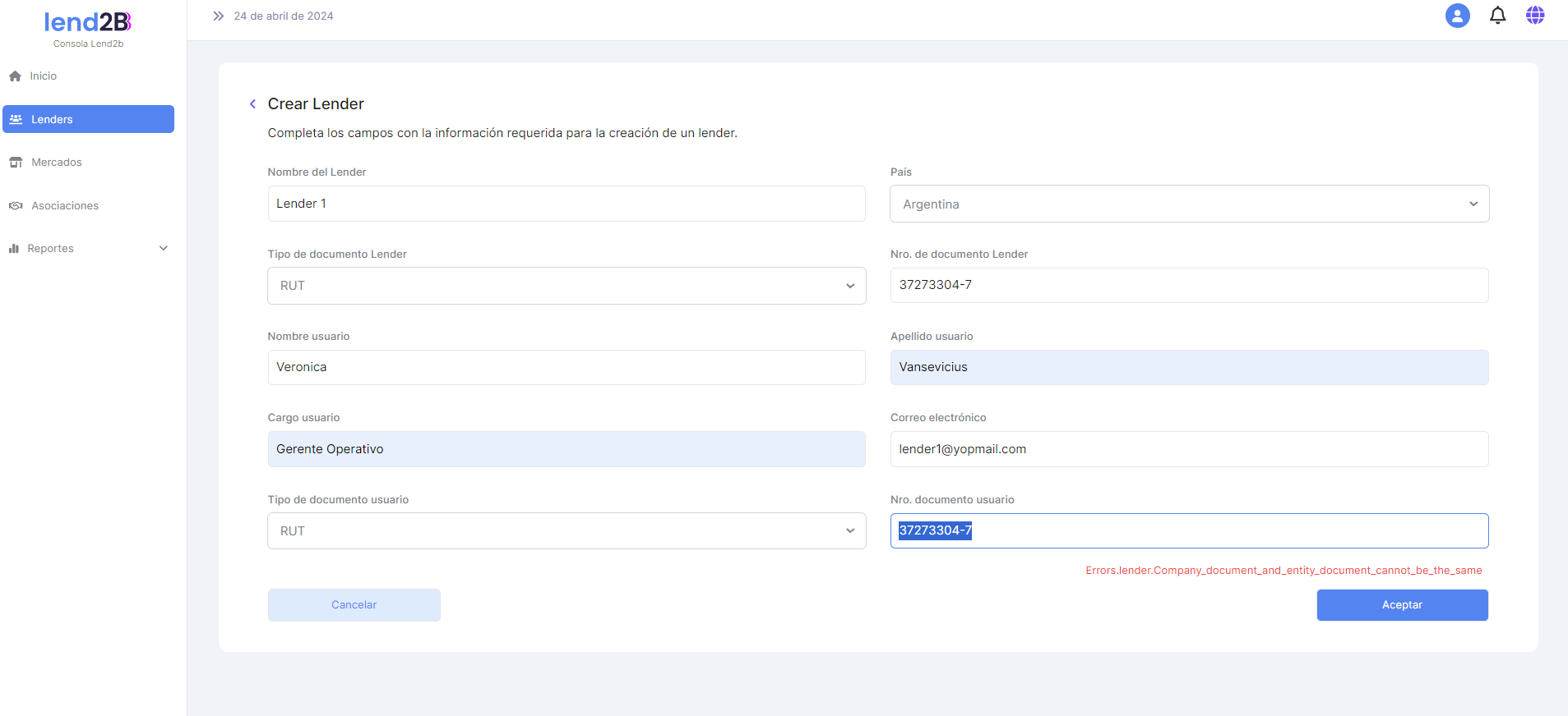 Se solicita incluir dentro de los datos a cargar al generar una nueva Asociación entre un Lender y un Mercado