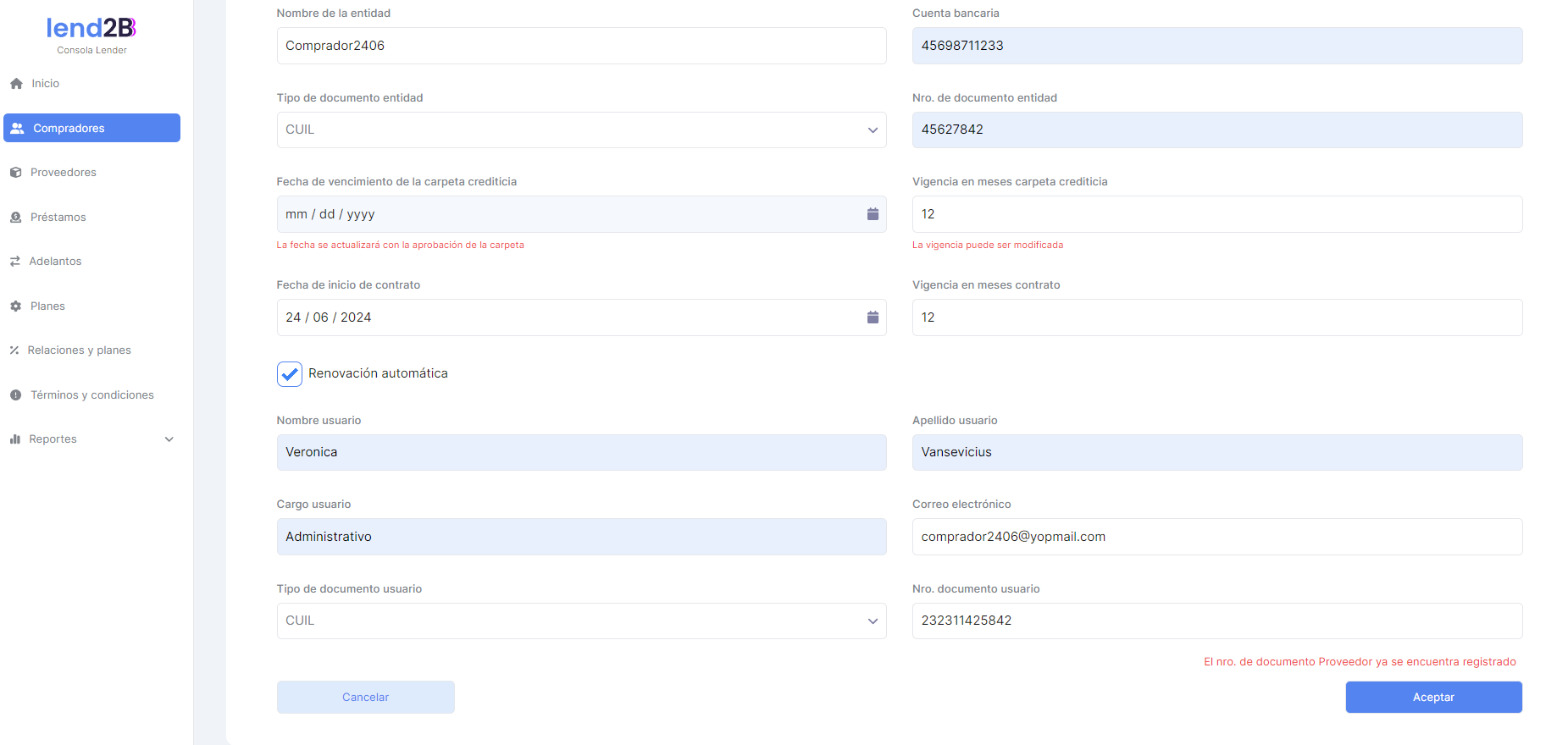 Si el Lender verifica que la cuenta informada es correcta y pertenece al Proveedor: