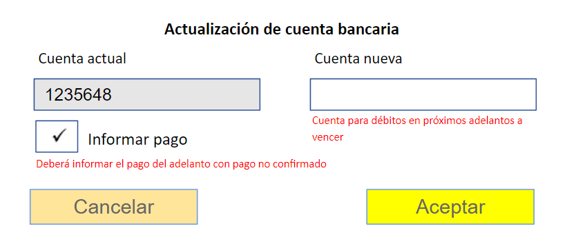 Importante: Al menos en un principio para el caso de pagos de Adelantos, no se define tiempos para completar la tarea de actualización de cuenta bancaria y/o selección de Informar pago.