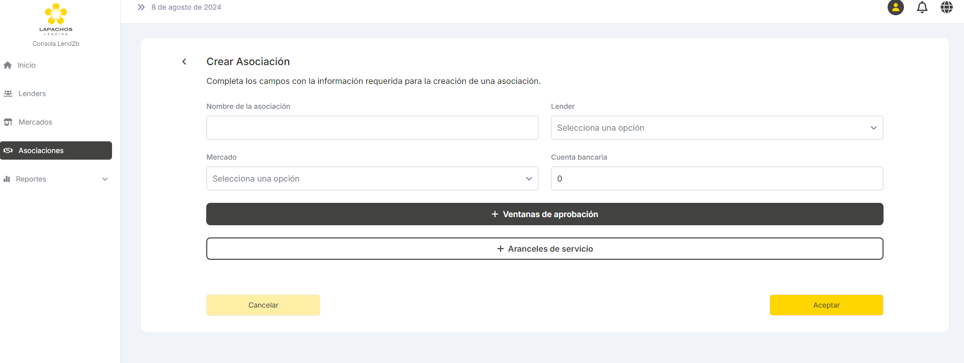 Asociación (en base al Lender seleccionado, listar para seleccionar la Asociación en estado Activo