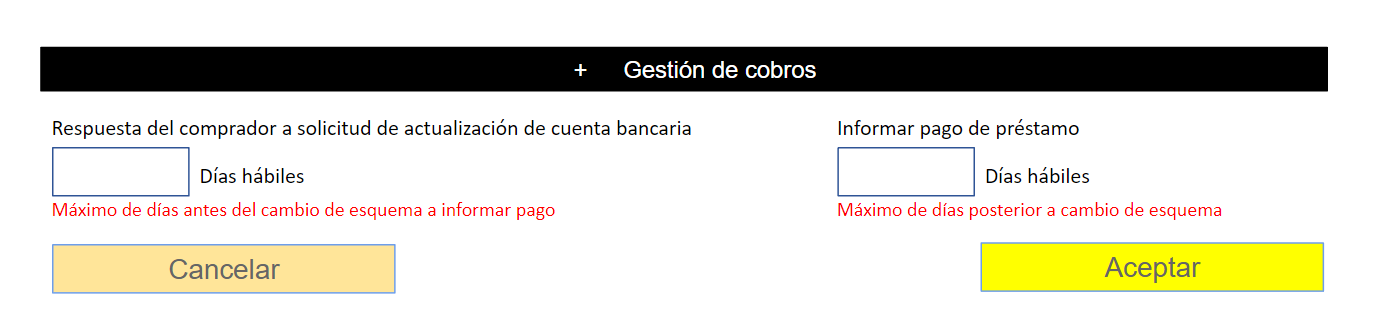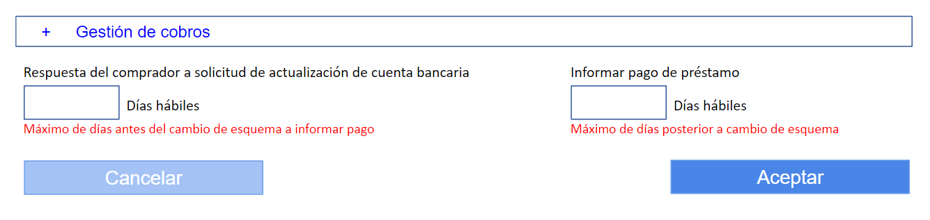 En este campo se debe completar la cantidad máxima de días hábiles requeridos para que el Comprador informe el pago del préstamo si hubiera seleccionado esa opción al momento de enviar la tarea de Actualización de cuenta bancaria.