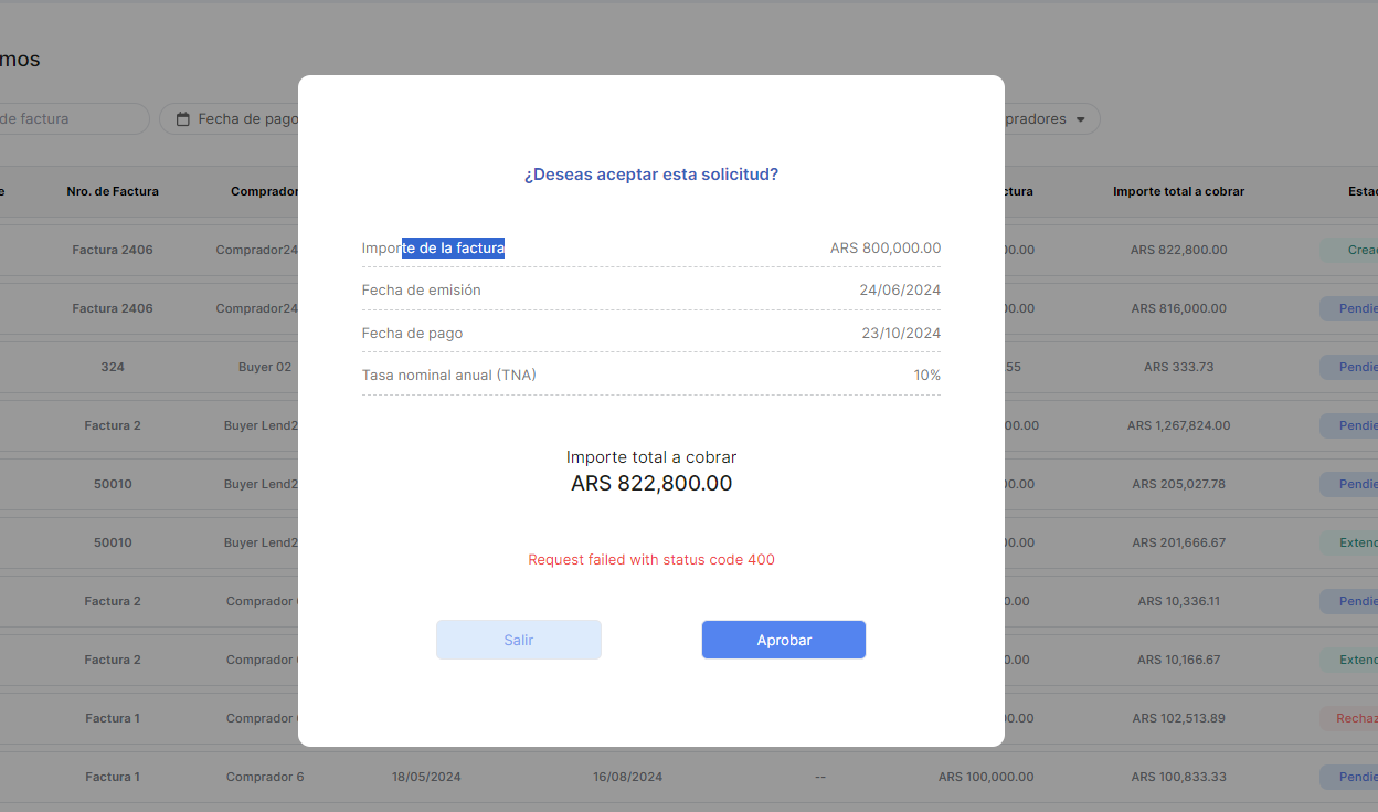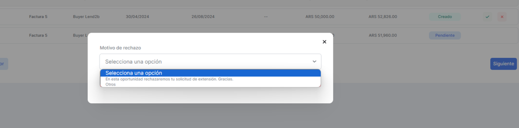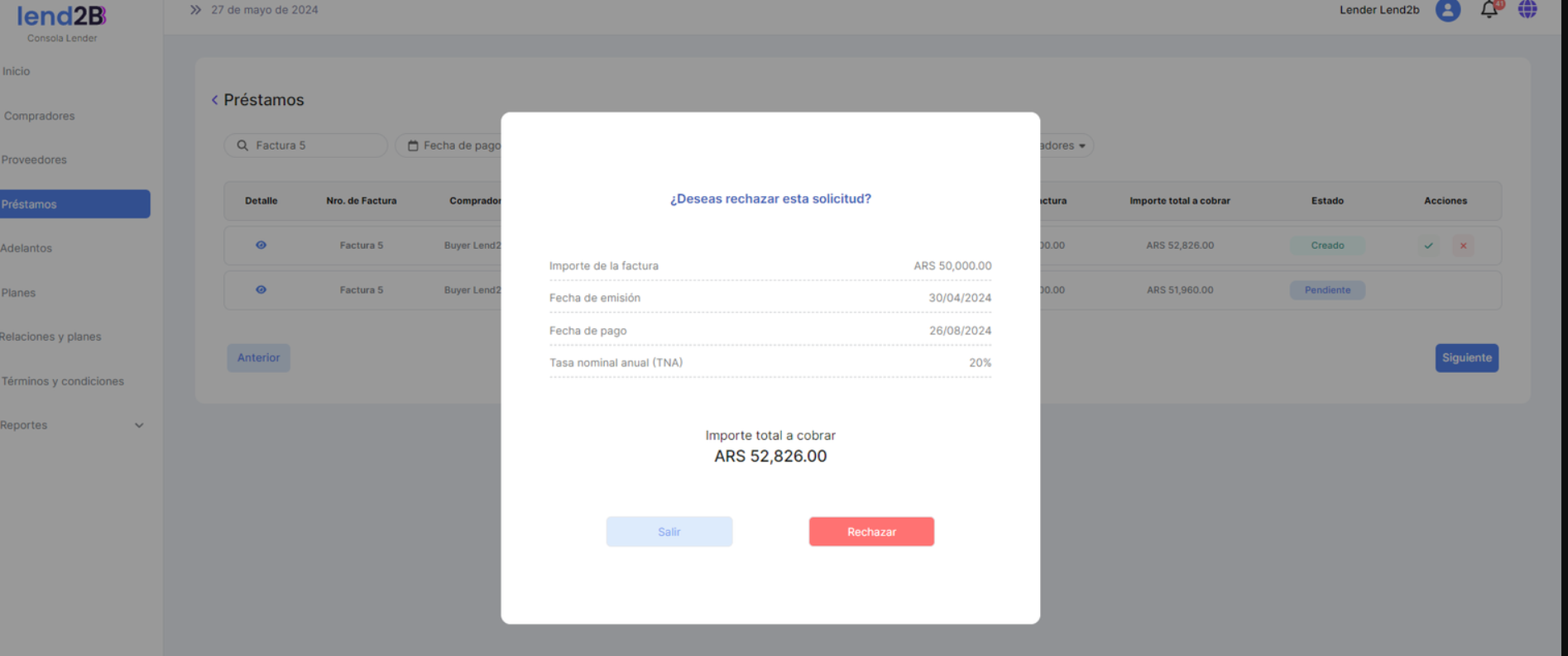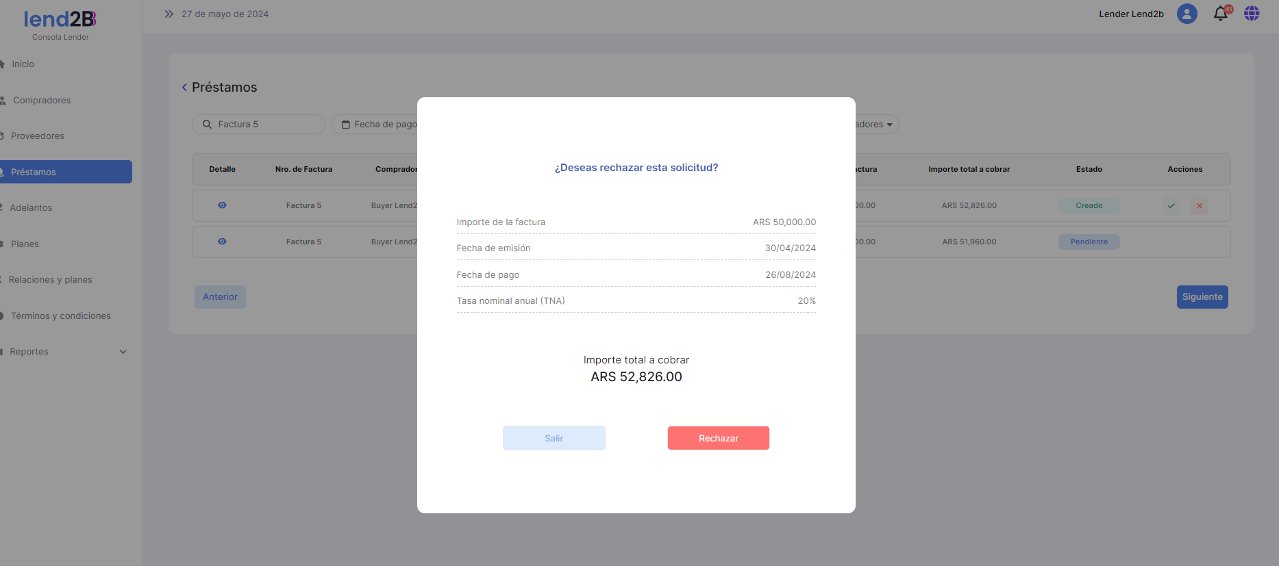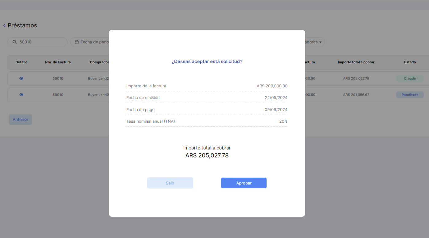 La solicitud puede ser aceptada o rechazada por el Lender desde la Consola en Lapachos Lending
