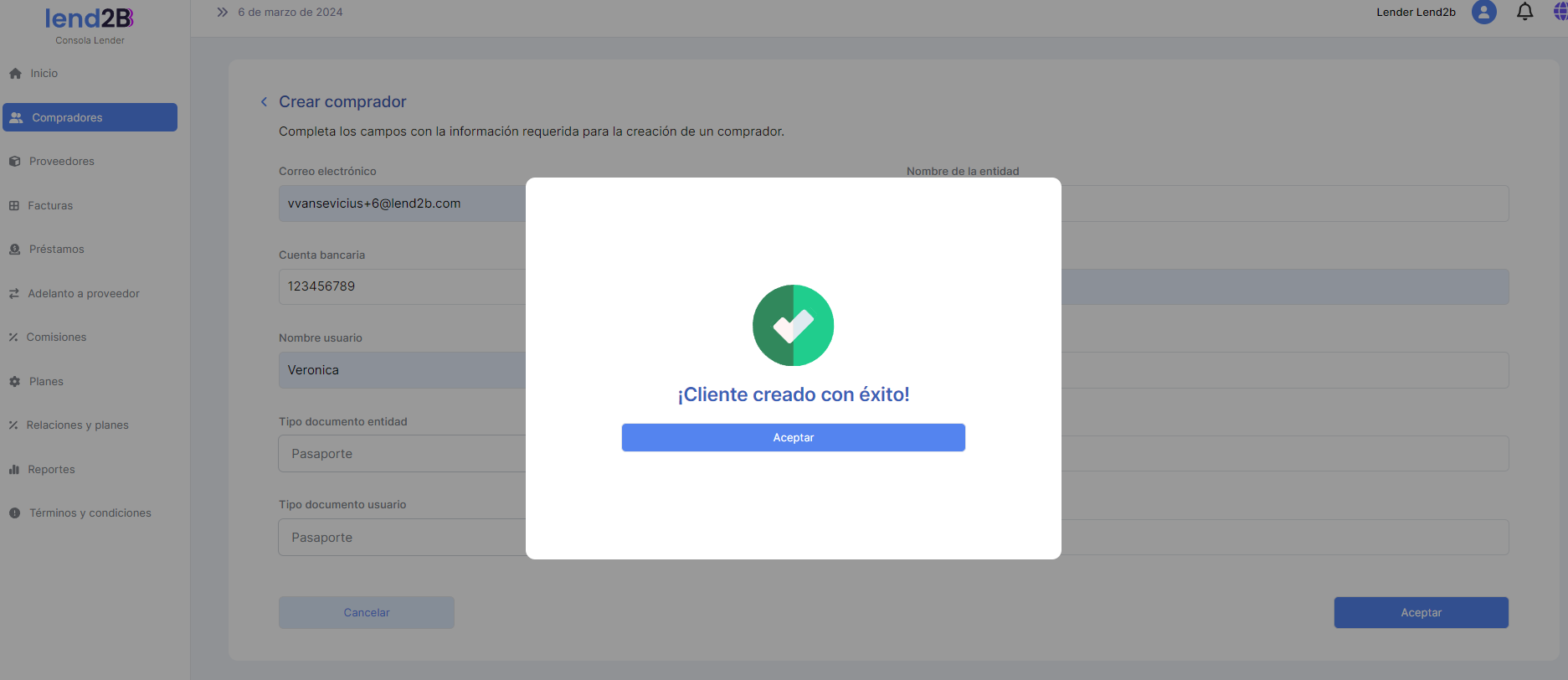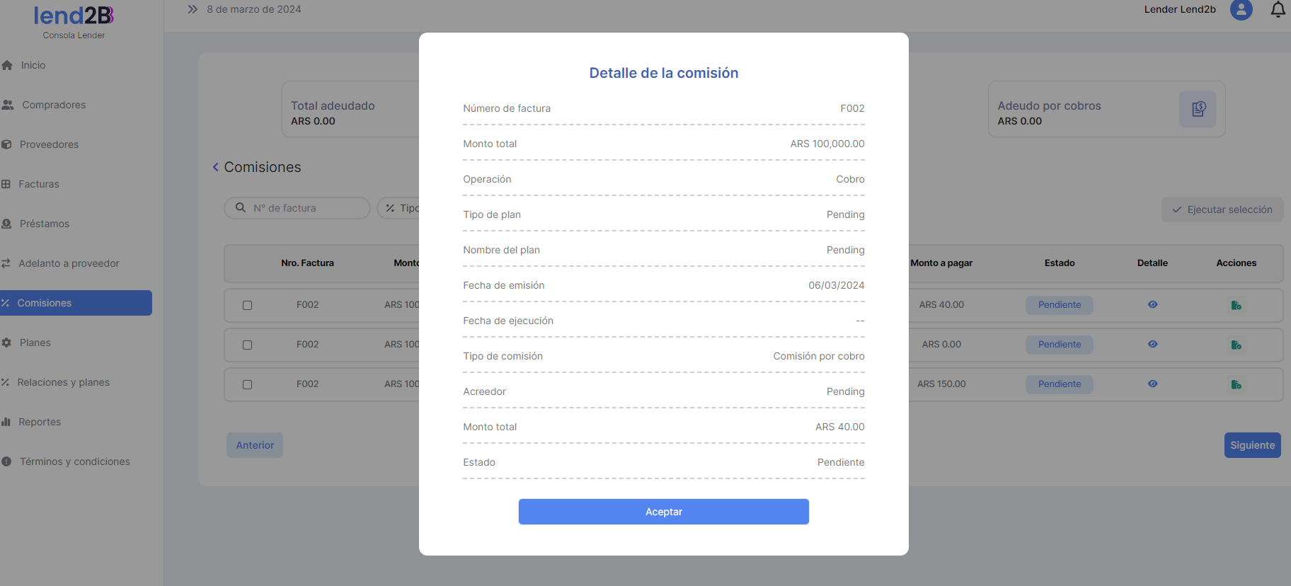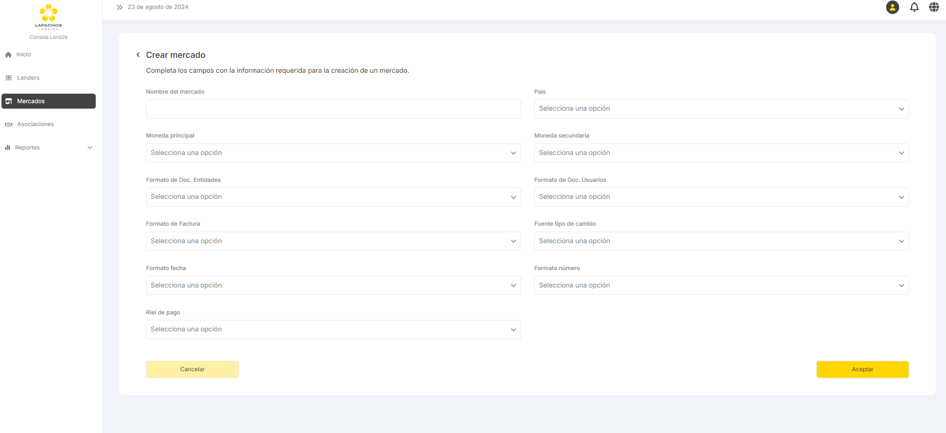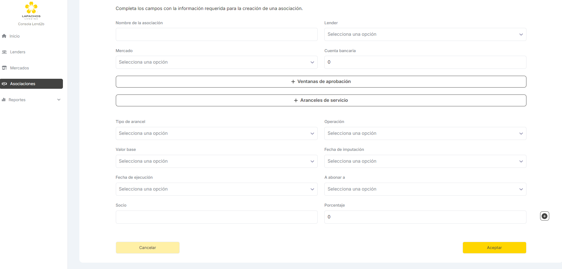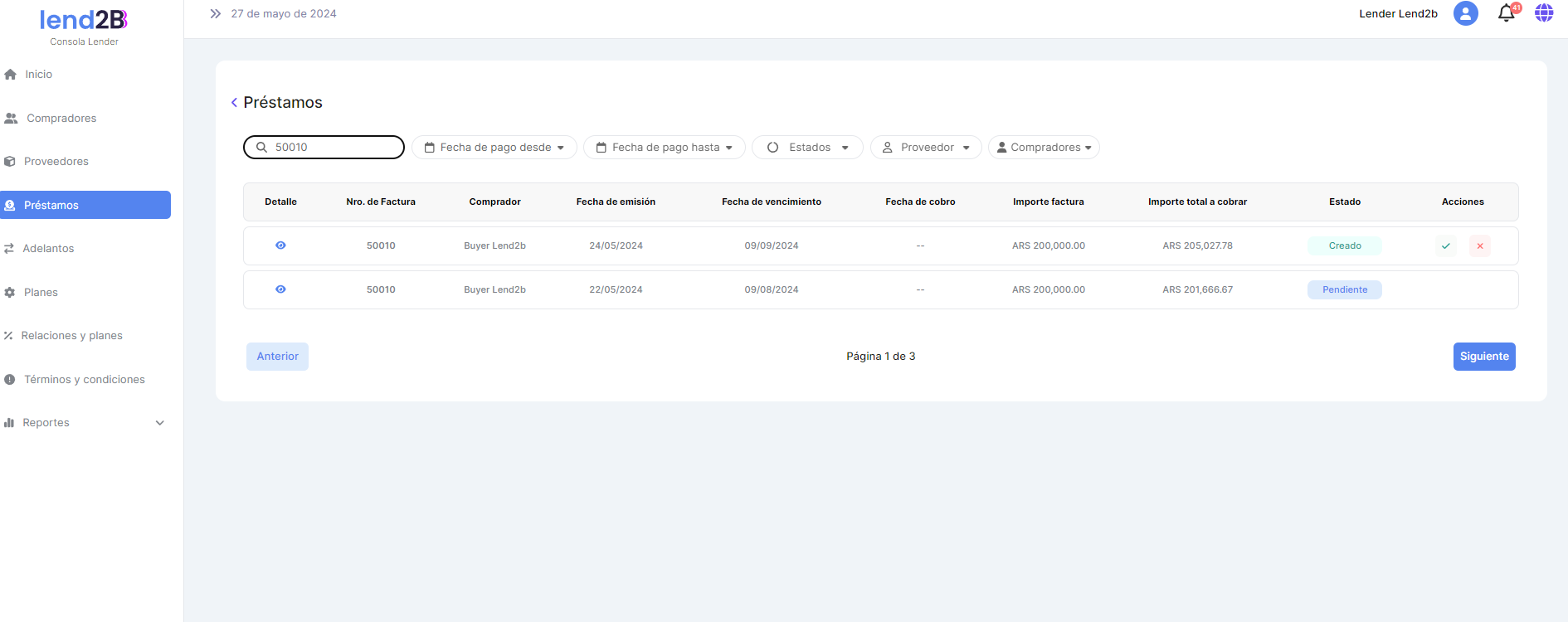 La solicitud puede ser aceptada o rechazada por el Lender desde la Consola en Lapachos Lending