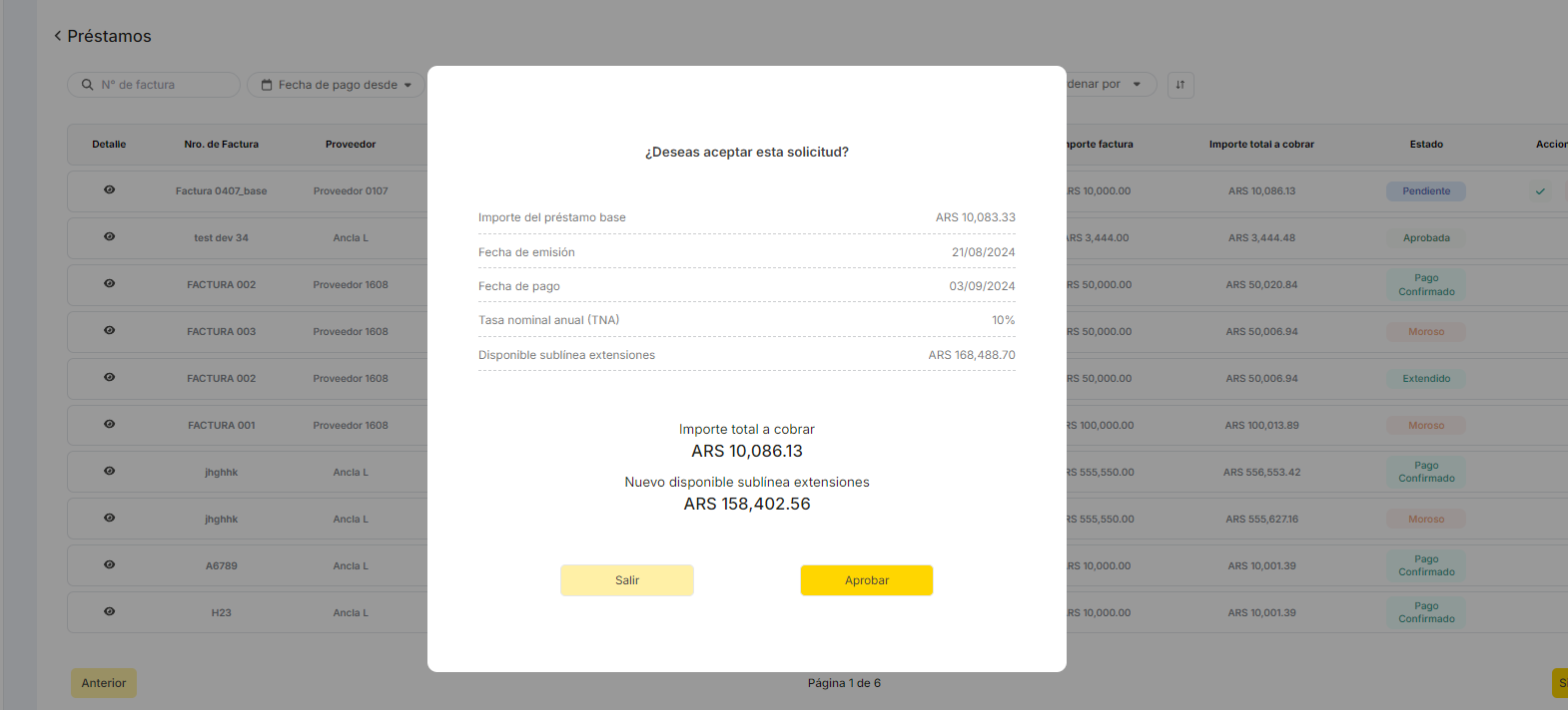 El registro del Préstamo extendido en Estado Pendiente ---> Estado Aprobado