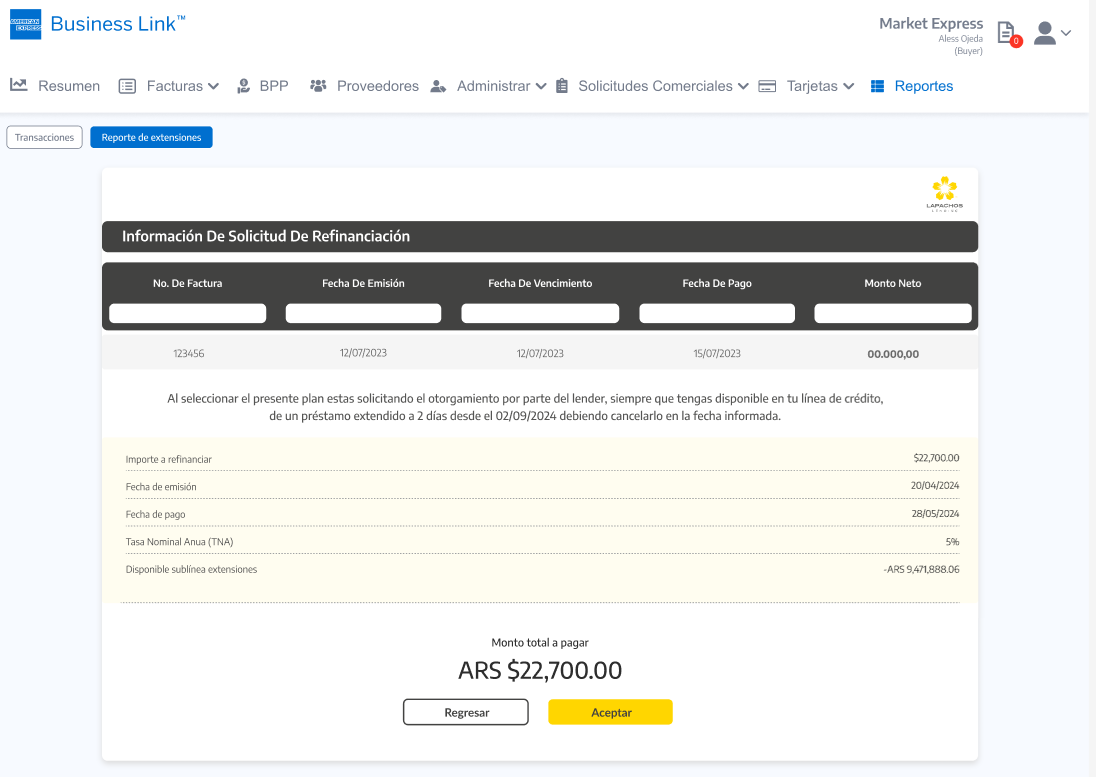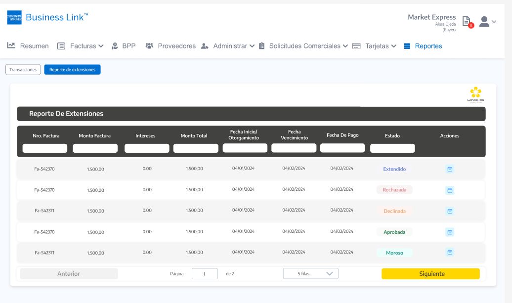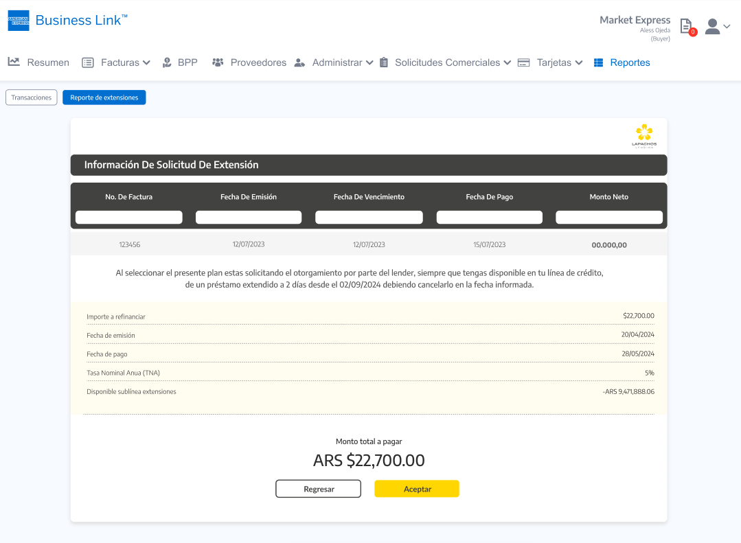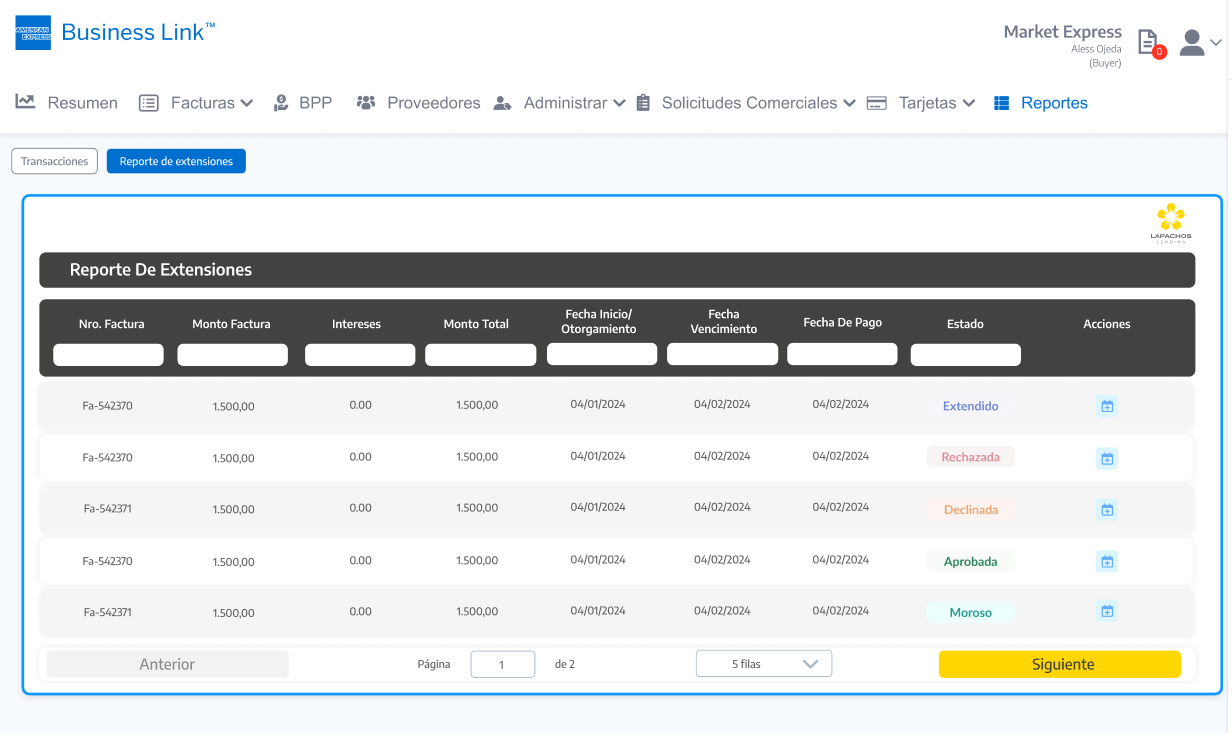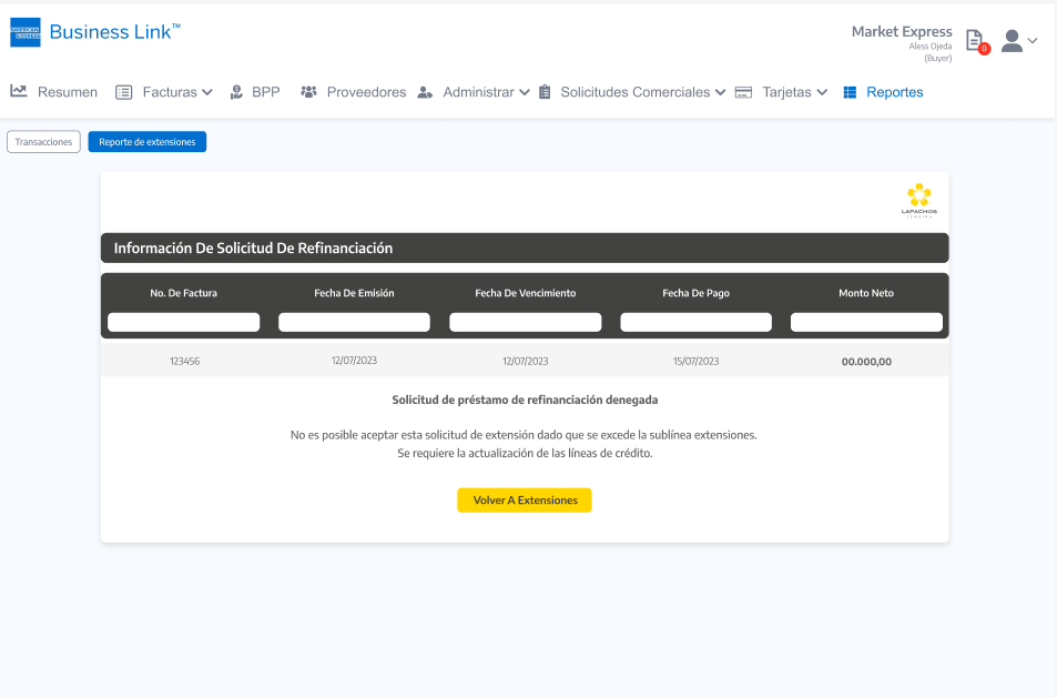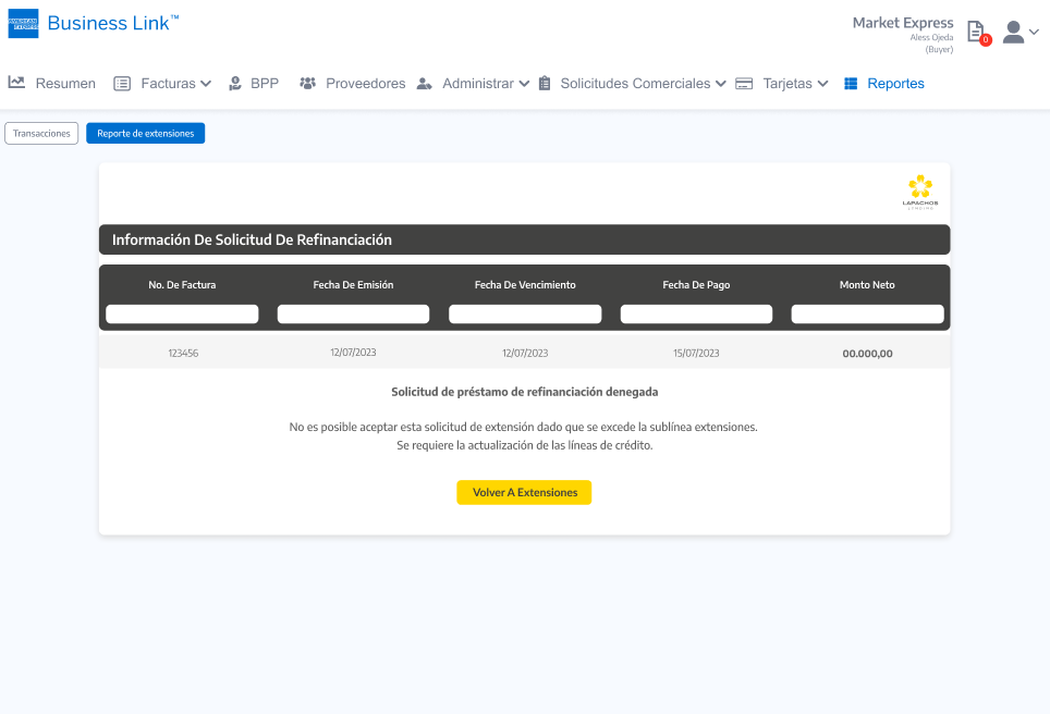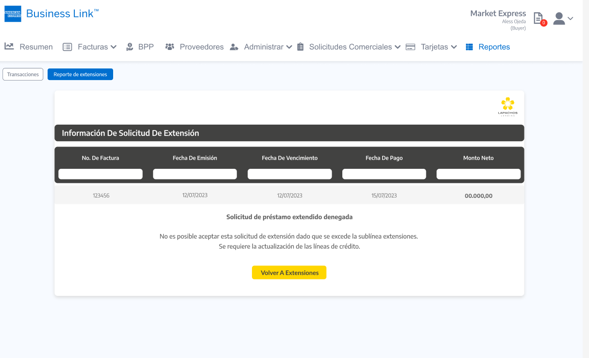Importante: Tal cual se aplica en la Consola del Comprador de Lapachos Lending, se permite como fecha limite para hacer la Solicitud de extensión la correspondiente a la Fecha de vencimiento del Préstamo base - los días hábiles definidos en el Campo de Solicitud de extensión de préstamo base