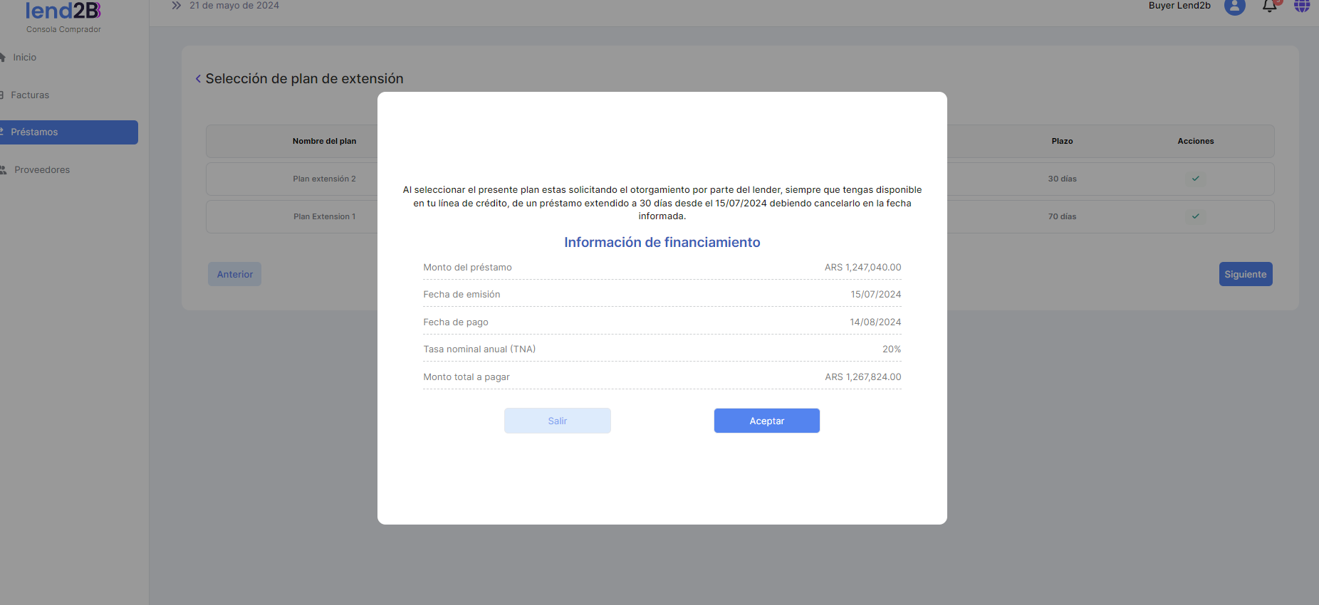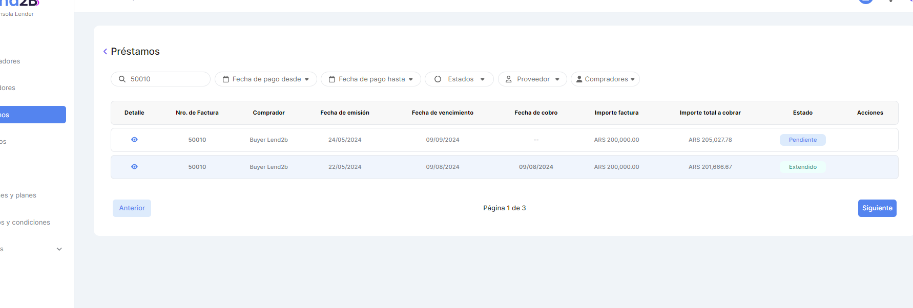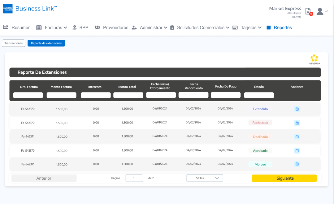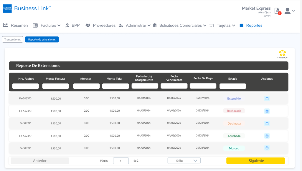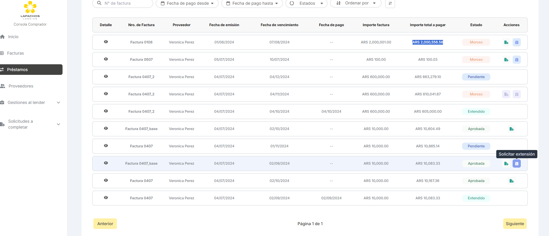 Importante: Tal cual se aplica en la Consola del Comprador de Lapachos Lending, se permite como fecha limite para hacer la Solicitud de extensión la correspondiente a la Fecha de vencimiento del Préstamo base - los días hábiles definidos en el Campo de Solicitud de extensión de préstamo base