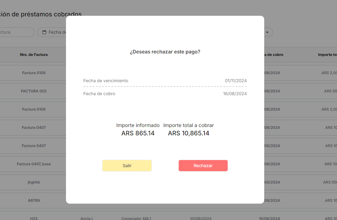 El registro del Préstamo extendido en Estado Pendiente ---> Estado Rechazado