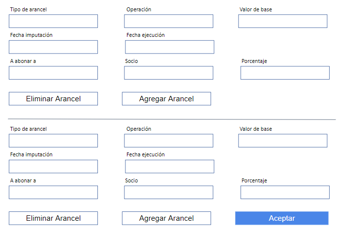 El botón Agregar Arancel permite ir habilitando nuevos esquema de aranceles hasta que se puedan cargar todos los asociados a la operatoria. Si hubo errores en alguno de los aranceles se elimina el bloque directamente.