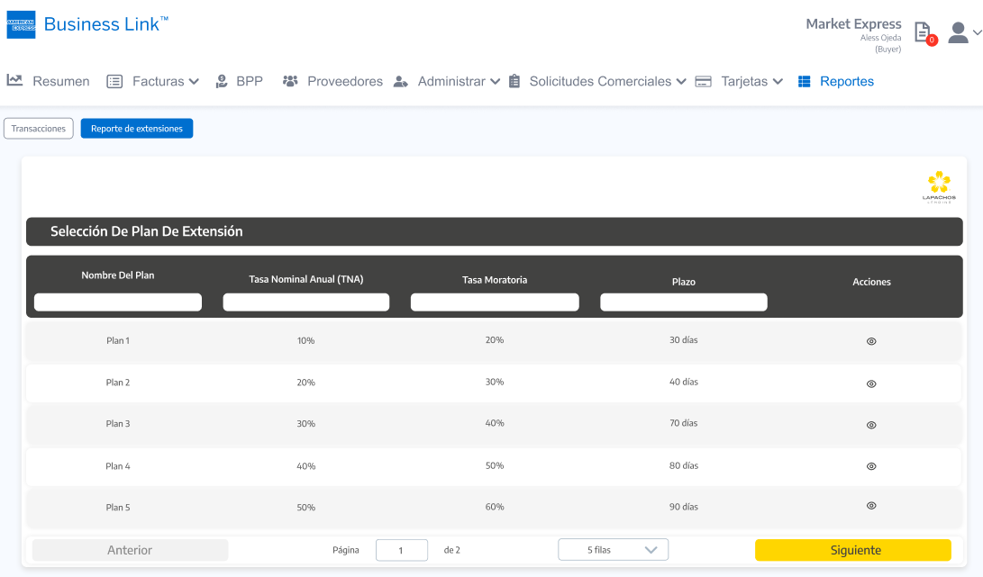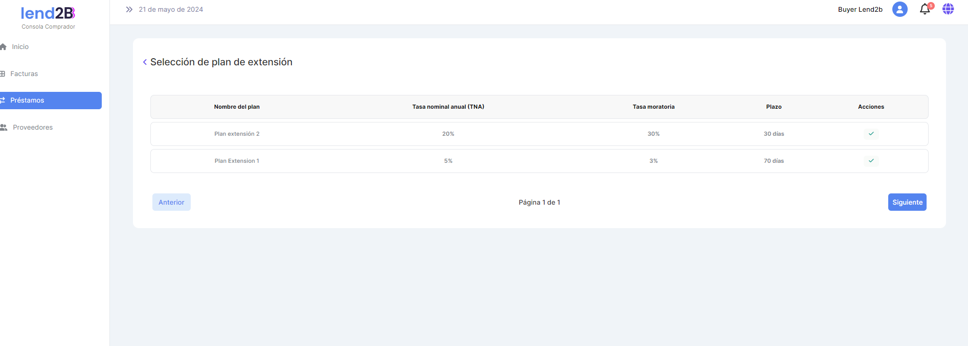 Al seleccionar el icono Solicitar extensión se debe acceder a una pantalla con los Planes extensión vigentes incluidos en las condiciones comerciales activas para el Comprador con el Proveedor:
