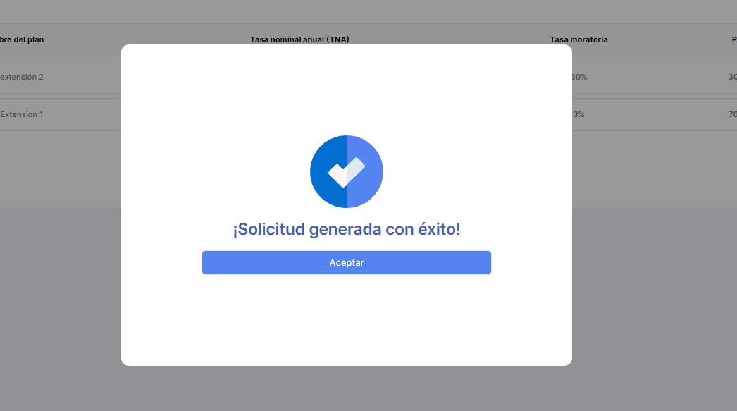 Cuando el comprador avanza sobre la solicitud de un préstamo extendido, si al seleccionar el Plan extendido correspondiente aparezca un modal similar a: