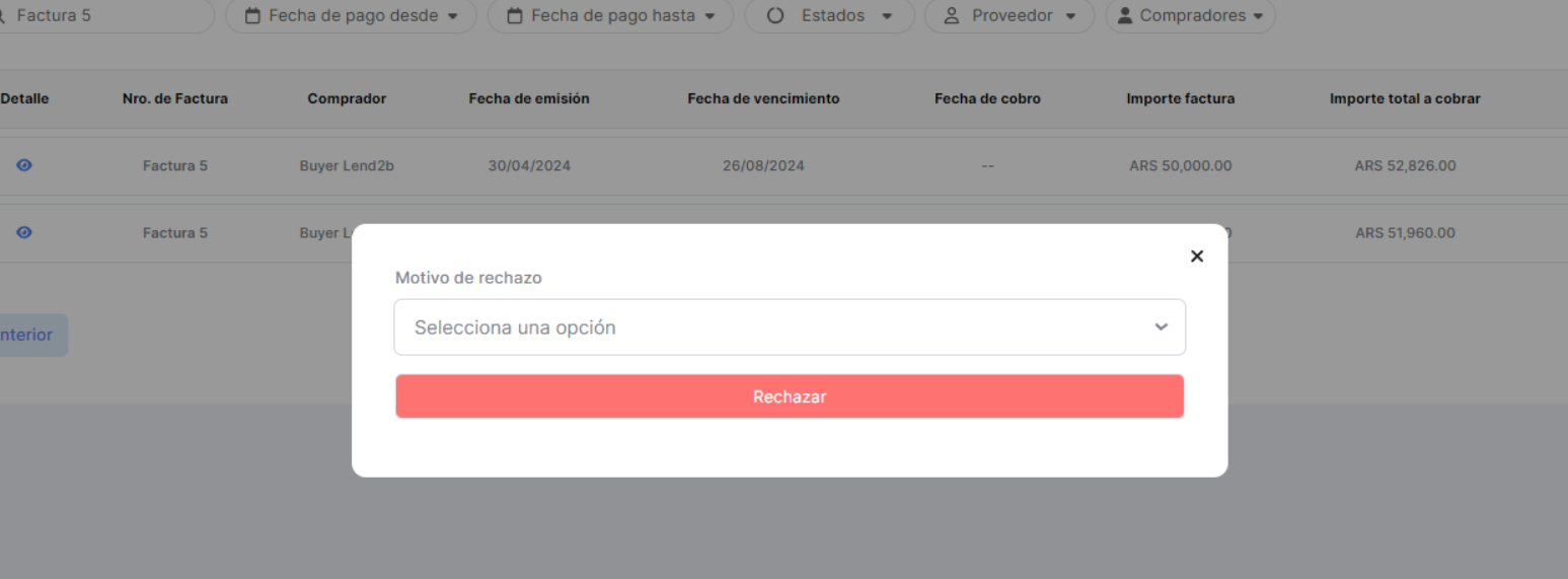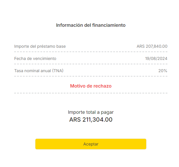 Para esta situación al acceder al icono de Detalle se debe mostrar el motivo de rechazo por parte del Lender.