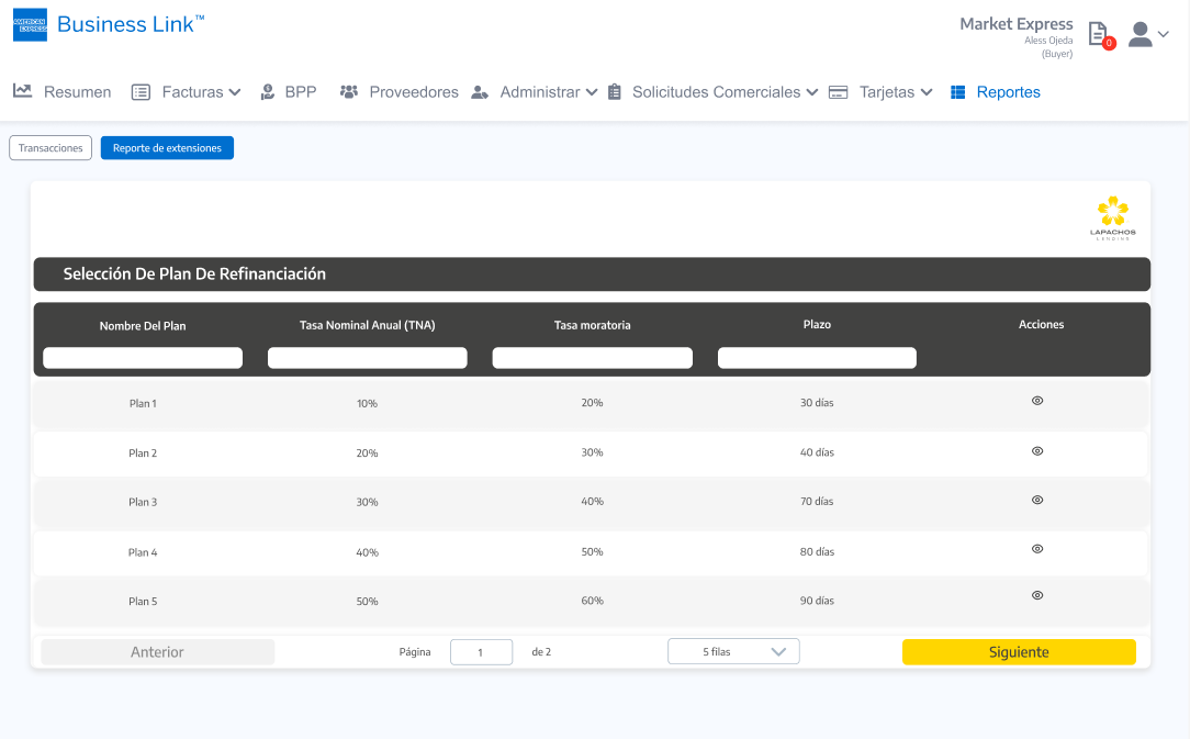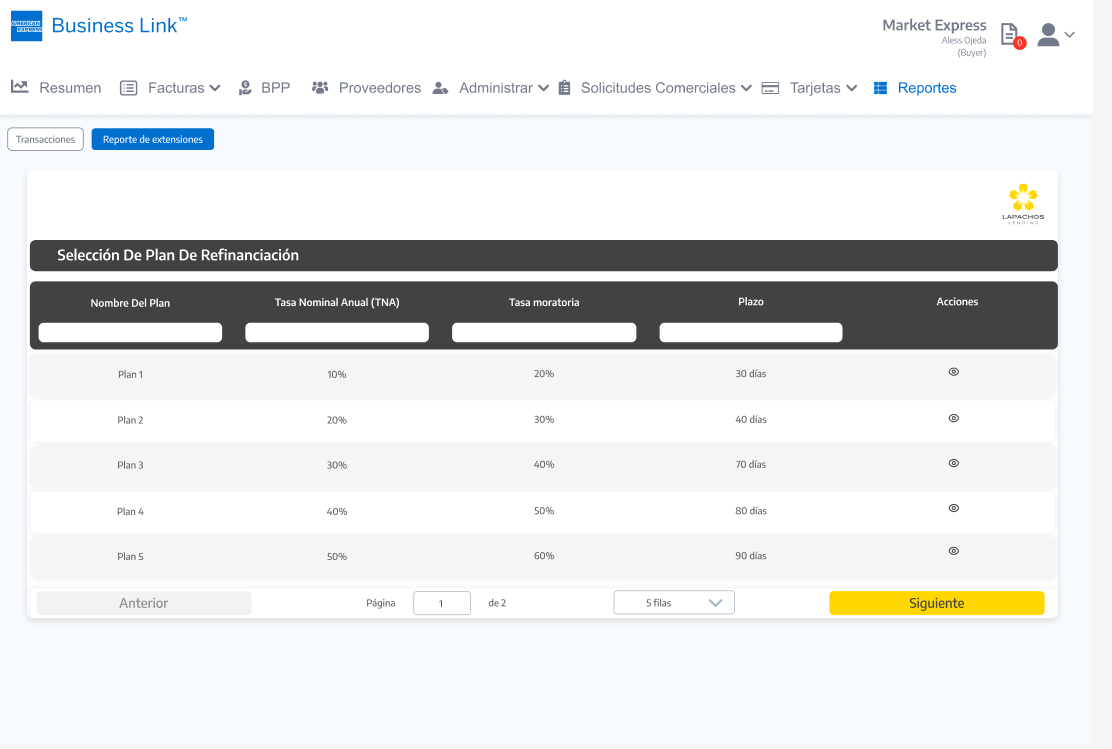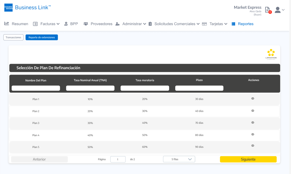 Al seleccionar el icono Solicitar refinanciación se debe acceder a una pantalla con los Planes refinanciación vigentes incluidos en las condiciones comerciales activas para el Comprador con el Proveedor:
