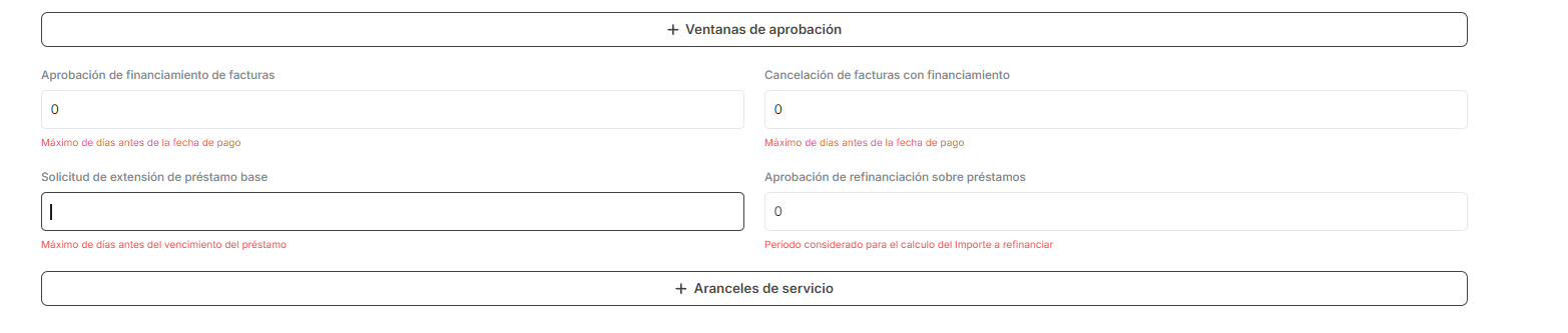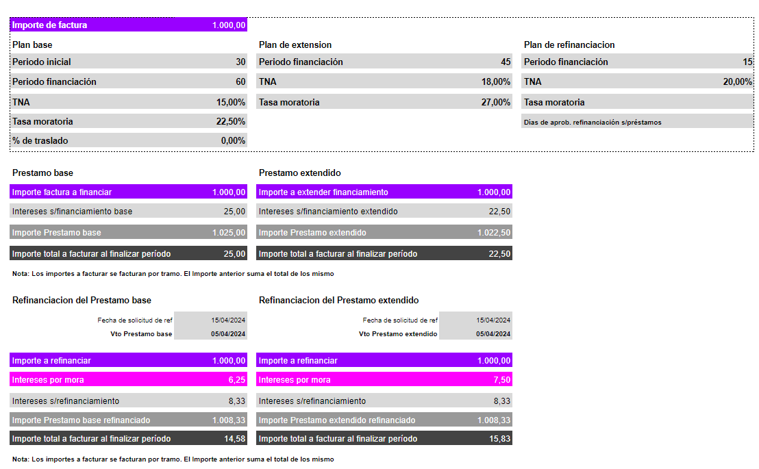 Importe a refinanciar = Importe del Préstamo [base o extendido] + (((Tasa moratoria del Plan [base o extensión]/Campo Días de negocio) *((Fecha de solicitud de la refinanciación-Fecha de vencimiento del Préstamo [base o extendido]) + 3 días hábiles desde fecha de solicitud)) * Importe del Préstamo [base o extendido]))
