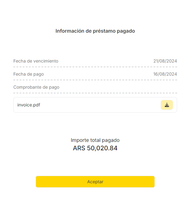 Si el Lender confirma correctamente el pago del Préstamo el proceso para este se cierra con: