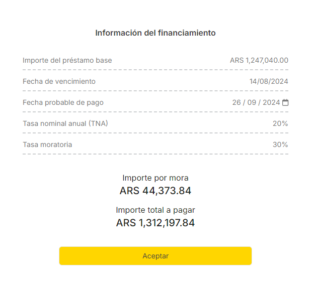 ((Tasa moratoria del Plan [base, extendido o refinanciado]/Campo Días de negocio) * (Fecha del día - Fecha de vencimiento del Préstamo [base, extendido o refinanciado]) * Importe de la Factura+ Importe de la Factura