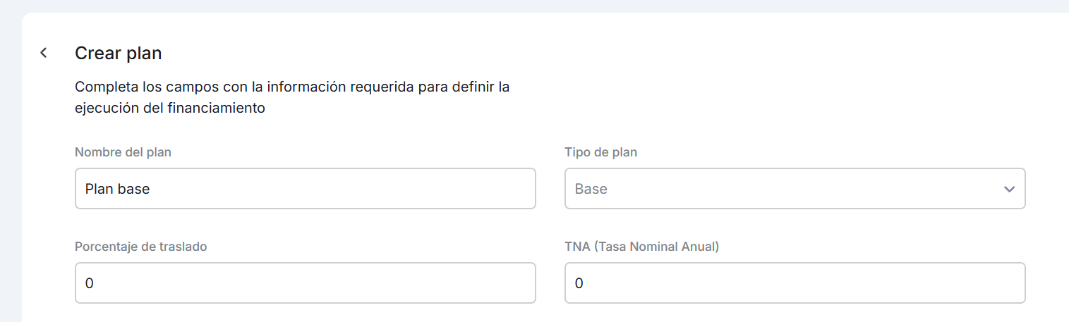 Período de financiación Solo para cuando el Plan original tiene la selección de 1 cuota. Si tiene el esquema de pago en cuotas debe mantenerse deshabilitado.