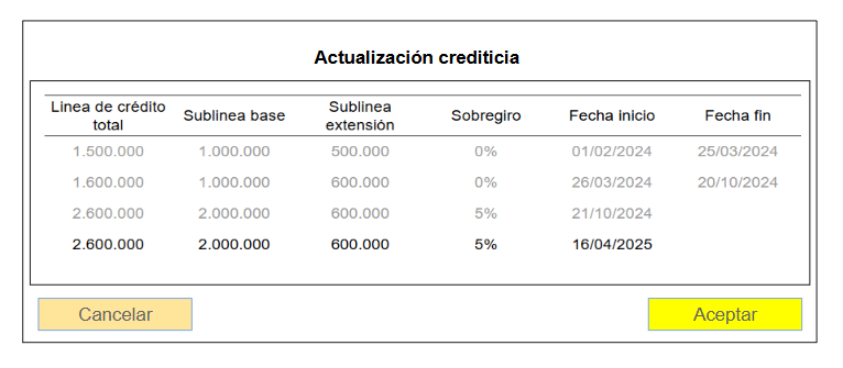 Disponible Línea de crédito total = Disponible de Sublinea base + Disponible Sublinea extensiones