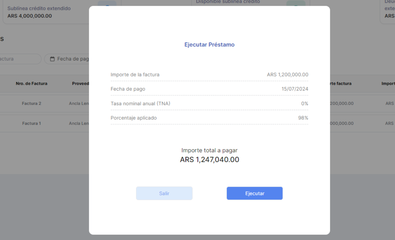 Nuevo Disponible sublinea base = Disponible Sublinea base - Importe del Préstamo base
