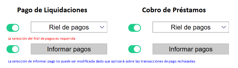 Al generar una TX para la ejecución automática de una cuota del Préstamo, en la Consola del Comprador se debe deshabilitar la opción de Informar pago a fin de no permitir la posible duplicidad de pago (manual y automática).