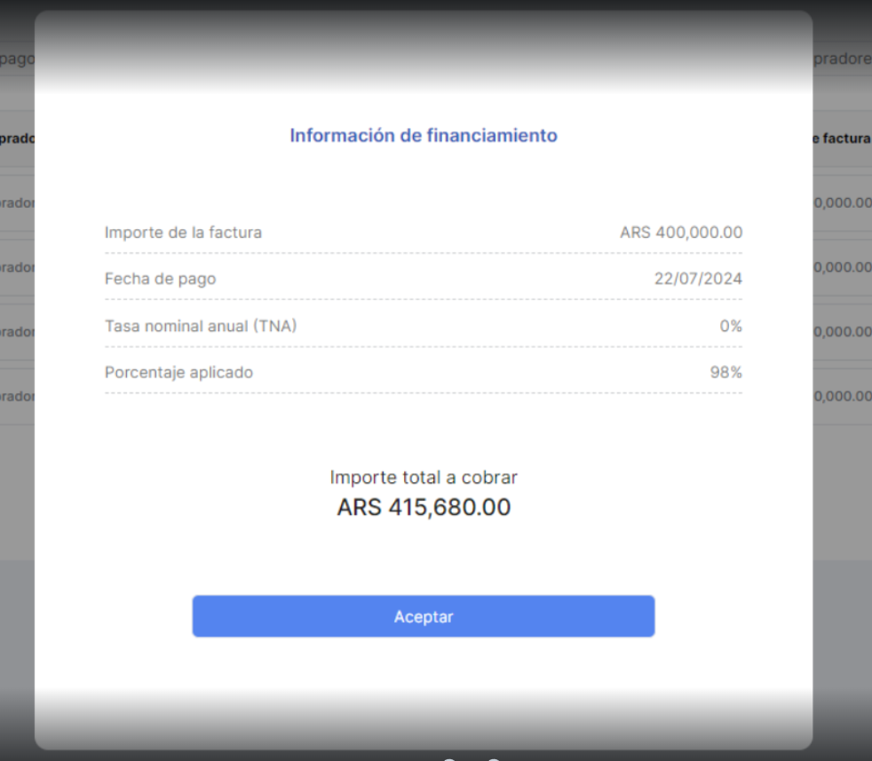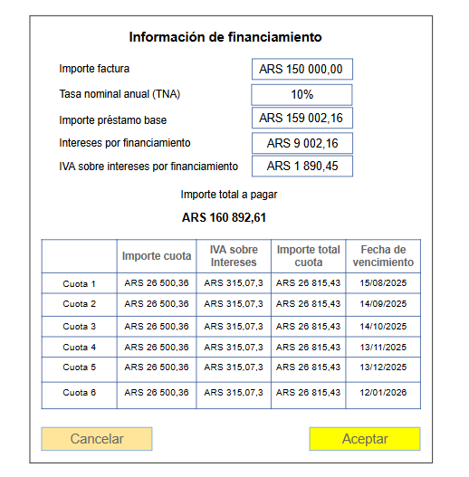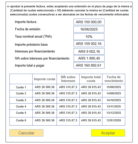 Cuota 1: Fecha de aprobación de la Factura (Fecha de otorgamiento del Préstamo) + 30 días.