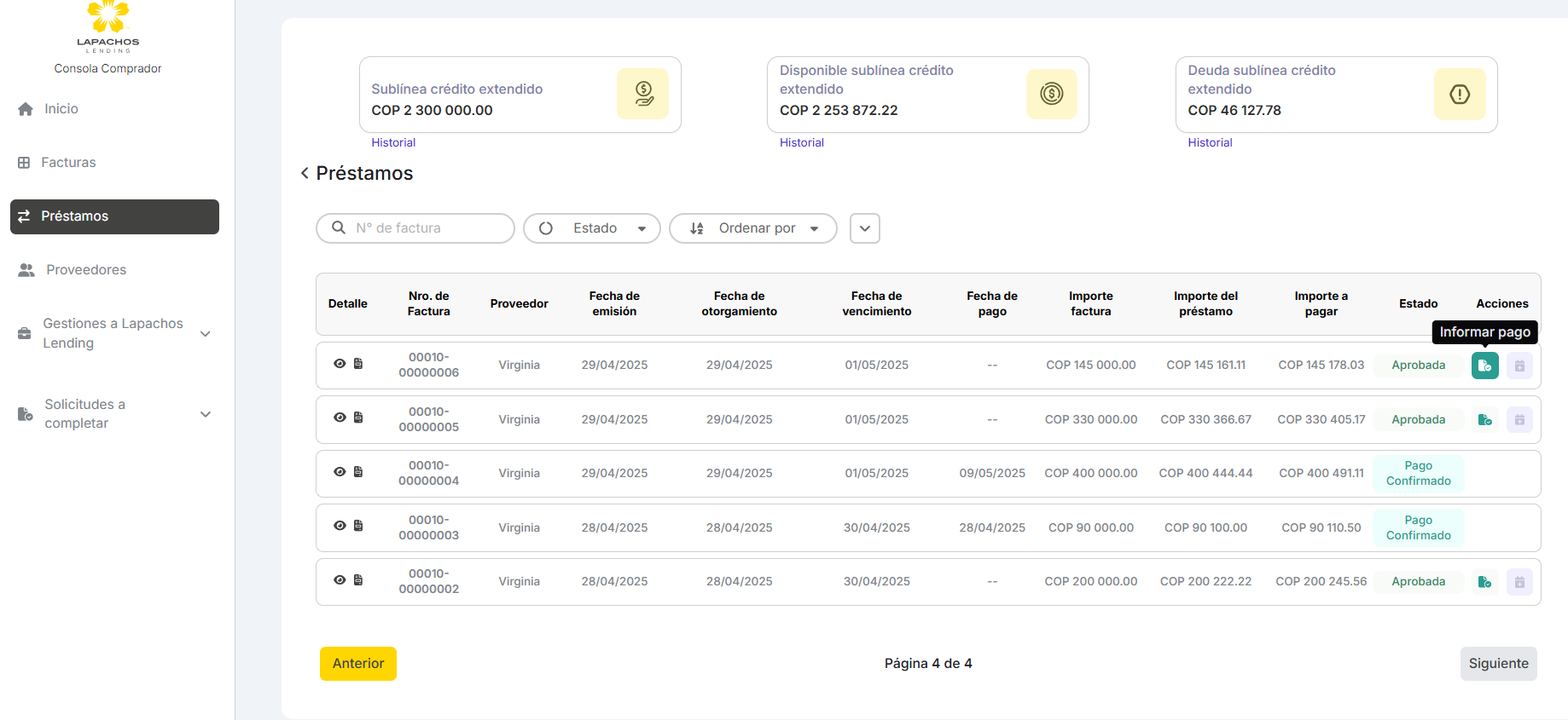 Cuando se abona un Préstamo la información que se muestra en Detalle debe pasar de la asociada al financiamiento a la del pago específicamente tanto en la Consola del Comprador como la del Lender.