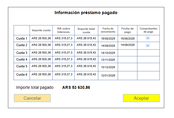 Esta misma diferenciación debe aplicar también para los prestamos a abonar en cuotas. Cuando se abona al menos la primera cuota del total al acceder a Detalle se debe mostrar lo siguiente: