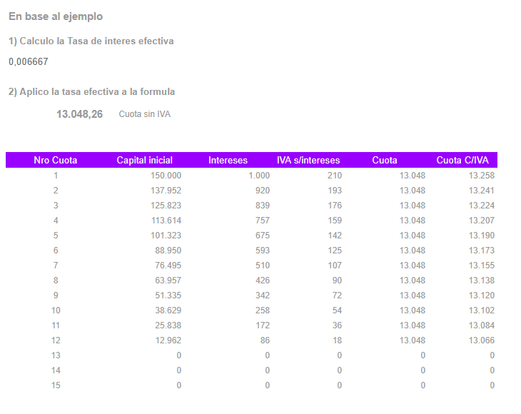 Se adjunta Excel con un ejemplo para el calculo de las cuotas