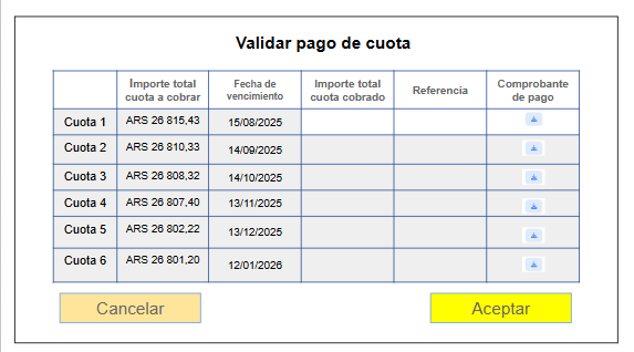 Con el objetivo de evitar errores en la validación de cuotas (ejemplo: por error valido el pago de la Cuota 4 en vez de la Cuota 2) se define que solo se puede validar la cuota con la Fecha de vencimiento mas cercana a la fecha actual y sin pago registrado anterior (es decir, en estado Pago cuota confirmado) . Se deben cumplir ambas condiciones.